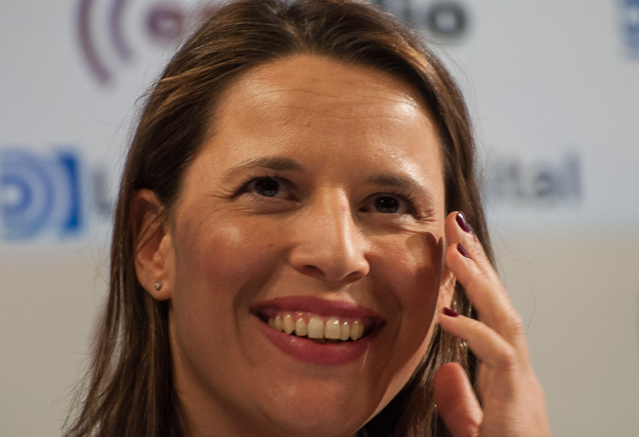 Primer plano de Isabel González, subdirectora del programa, en un momento de la emisión de Es la Mañana desde el cine Palafox de Madrid