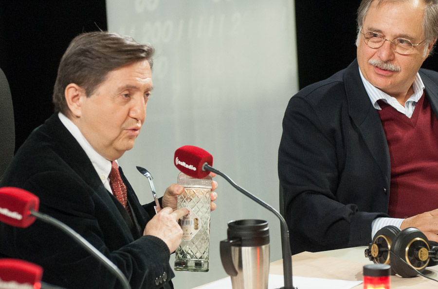 Federico Jiménez Losantos, con una botella a modo de instrumento musical navideño, y Luis Herrero en otro momento de la emisión en directo de Es la Mañana desde el cine Palafox