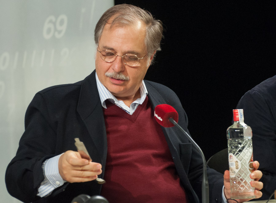 Luis Herrero observa atentamente la cuchara mientras mantiene en la mano la botella que sirve de instrumento musical navideño en un momento de la emisión de Es la Mañana de esRadio desde el cine Palafox