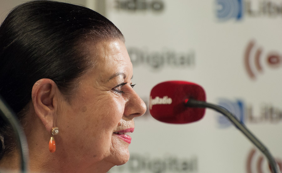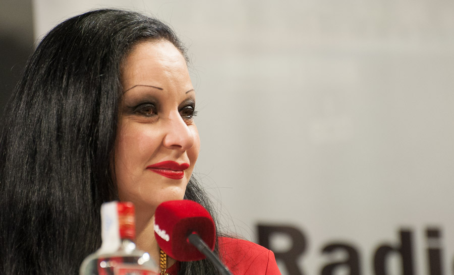 Carmen Jara frente al micrófono en un momento de la Crónica Rosa de Es la Mañana de esRadio, emitido en directo desde el cine Palafox de Madrid