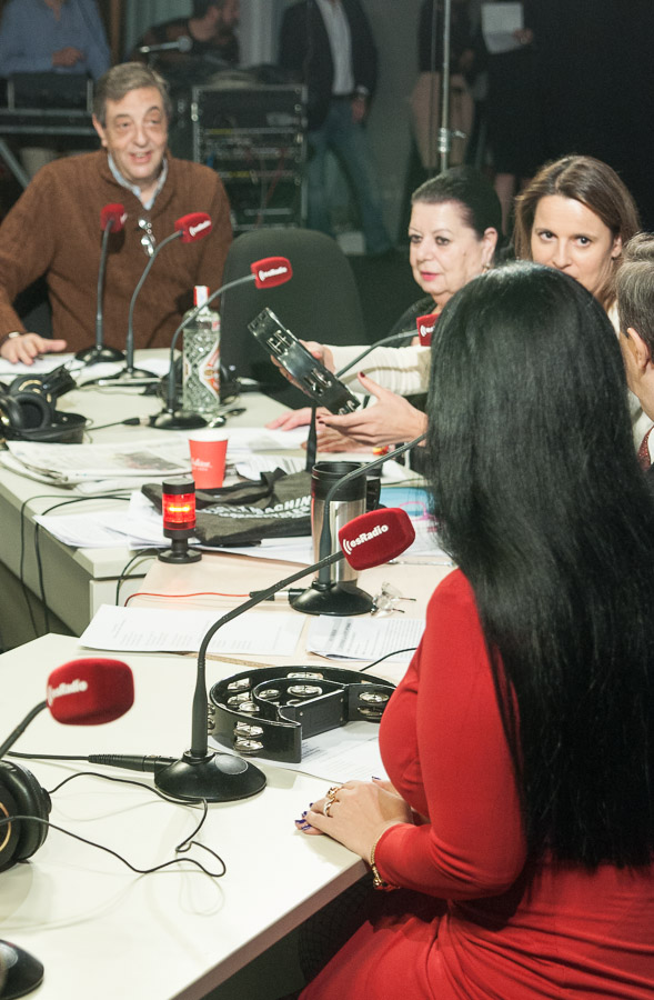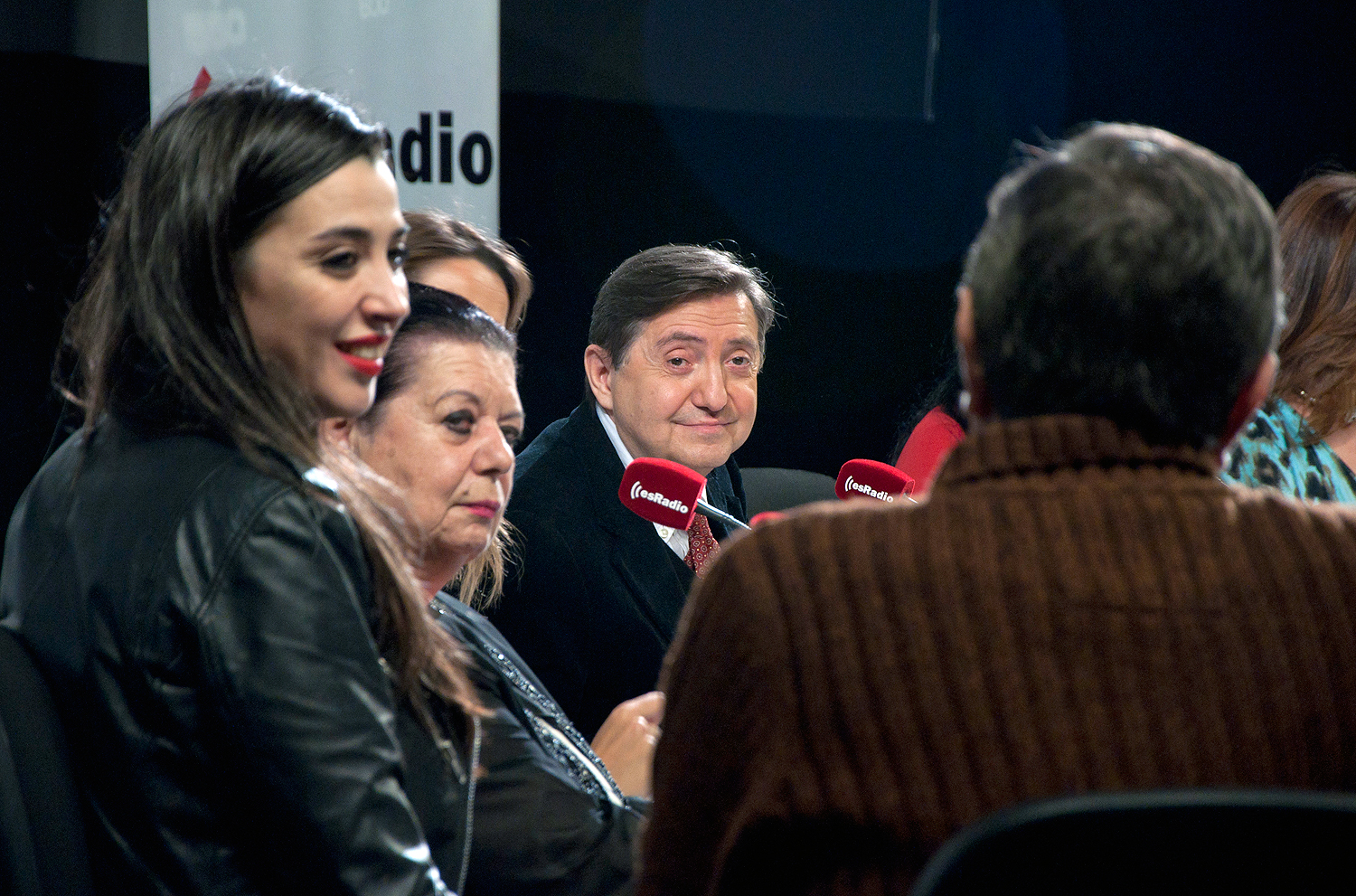 Marta Vaquerizo, conocida como Nancy O, saluda a Federico Jiménez Losantos ante la atenta mirada de Isabel González, en los momentos previos a su intervención en Patio de Butacas de Es la Mañana