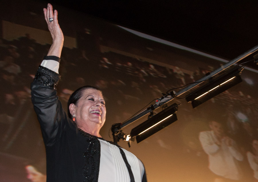 Una imagen en la que podemos ver al público en pie en la pantalla, aplaudiendo a rabiar a Carmen Jara