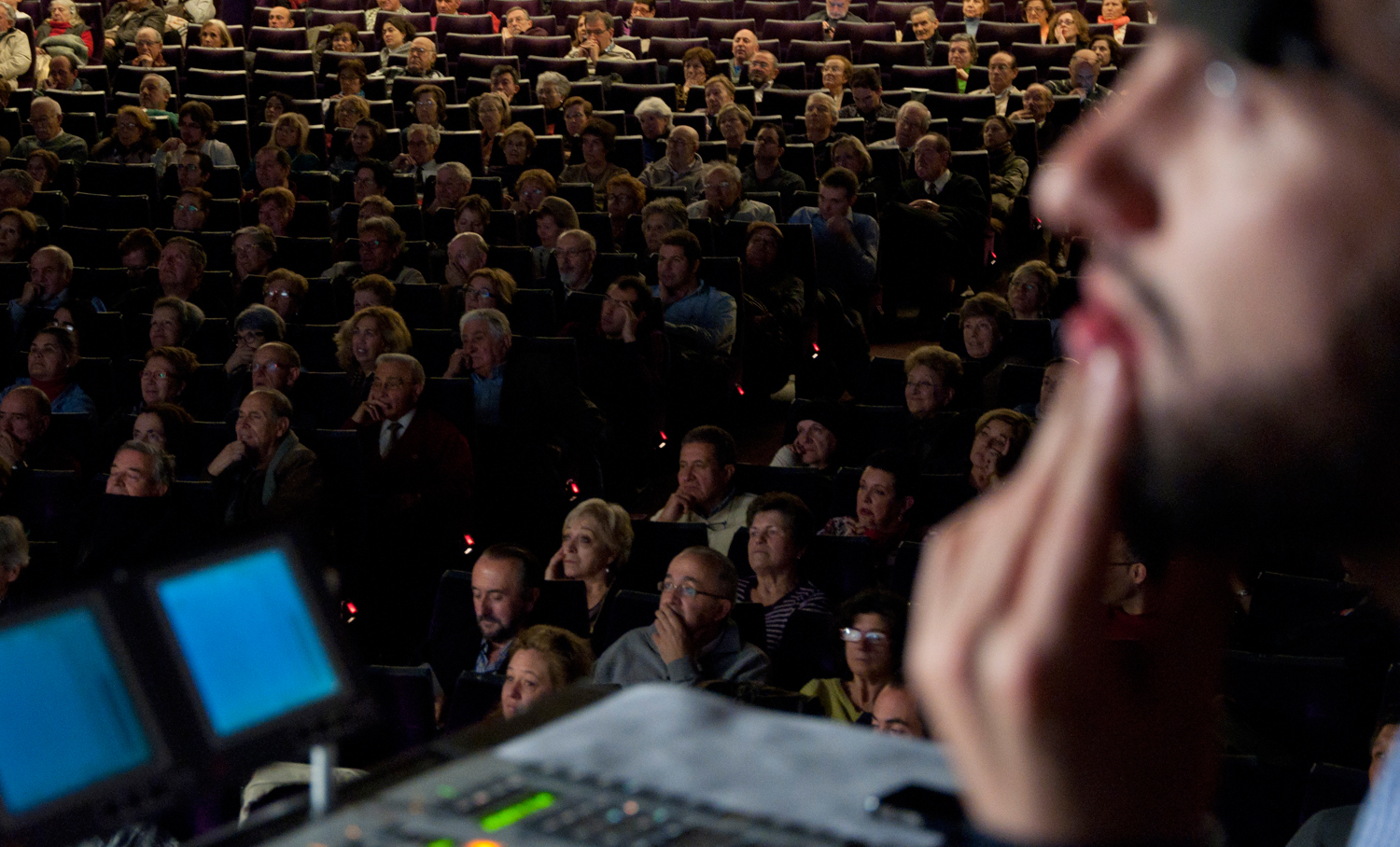 El público ha llenado el cine Palafox en Madrid. En primer plano uno de los técnicos de sonido.