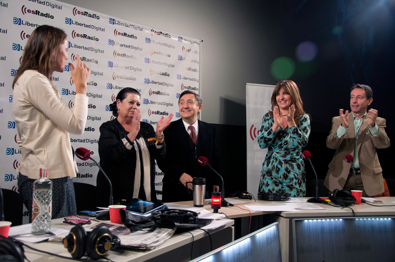 Federico Jiménez Losantos recibe a Carmen Jara con un abrazo, mientras Isabel González, de pie, Alaska, Beatriz Cortázar y Carlos Pérez Gimeno aplauden