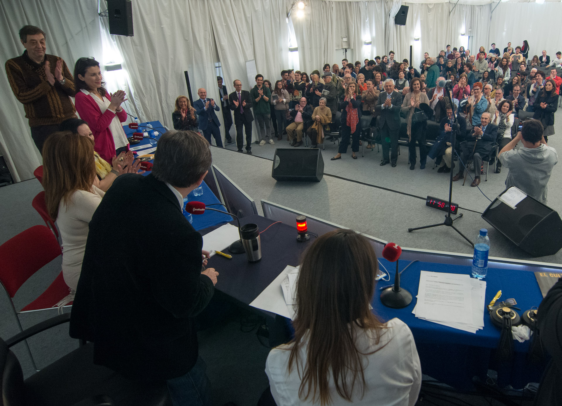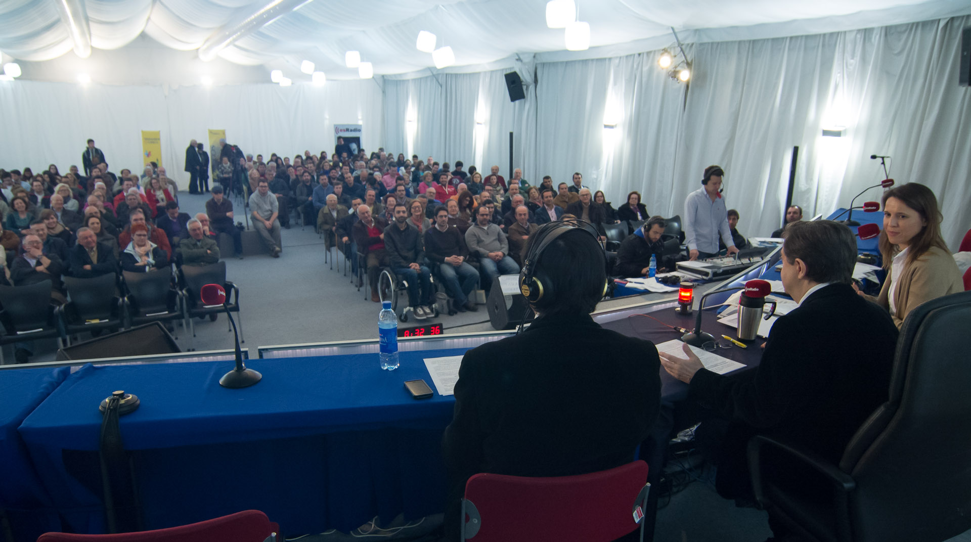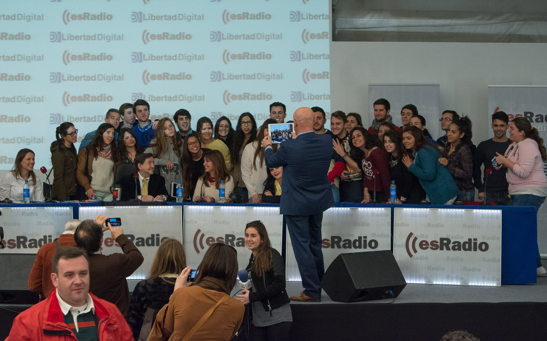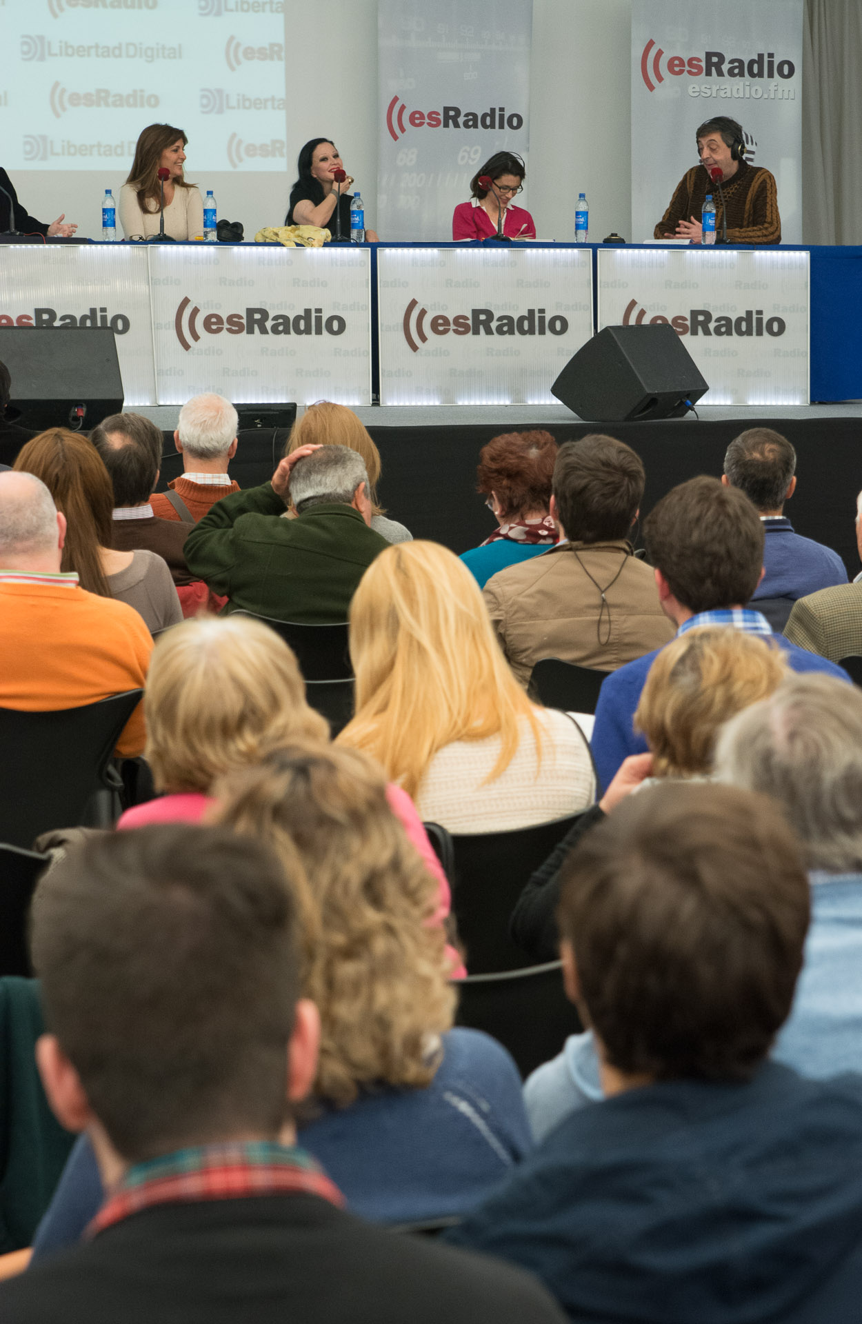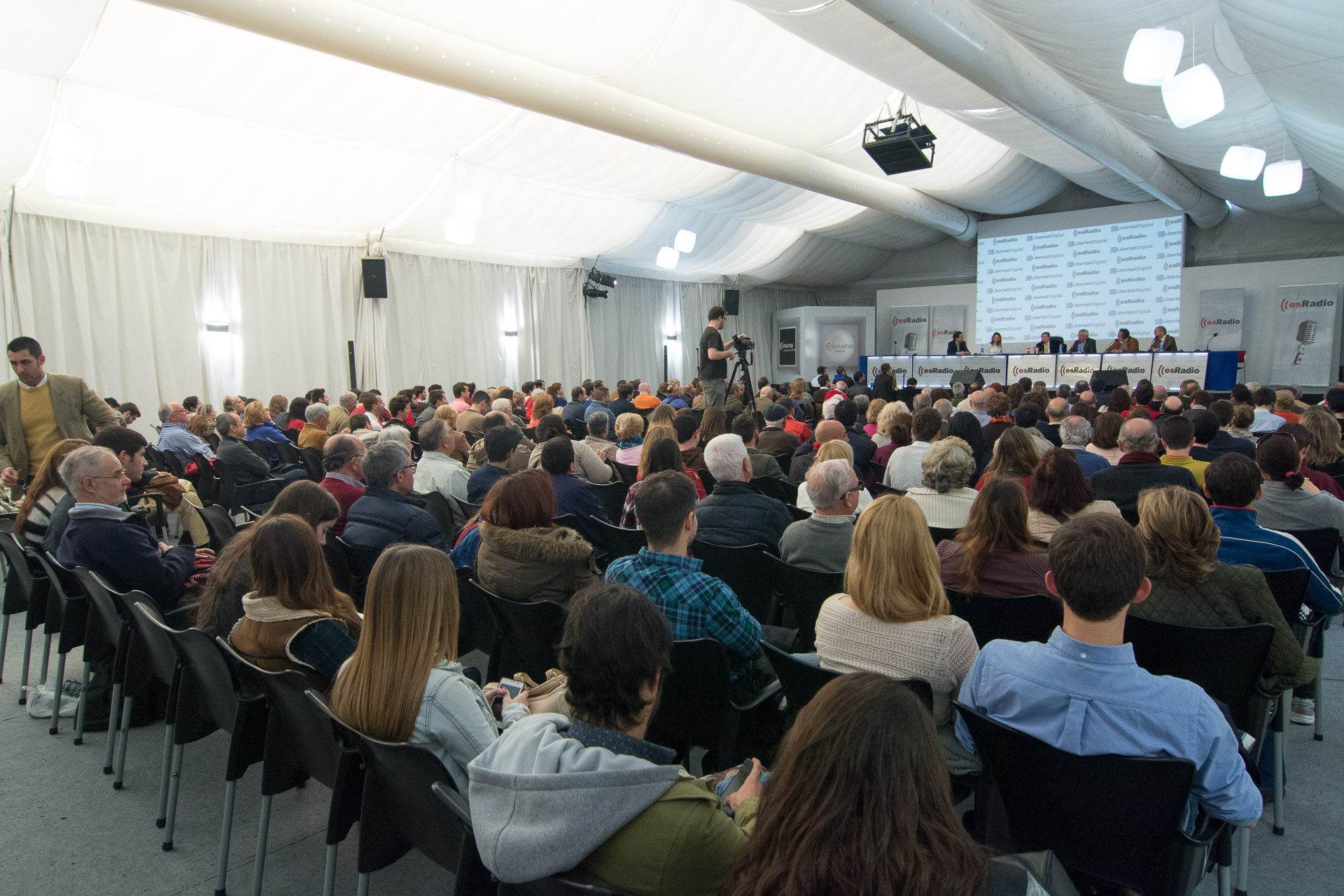 Vista desde detrás de la mesa de tertulia de Es la Mañana de Federico. De derecha a izquierda, Dieter Brandau, Isabel González y Federico Jiménez Losantos. Al fondo, el público asistente a la emisión en directo del programa desde el campus EUSA de Sevilla