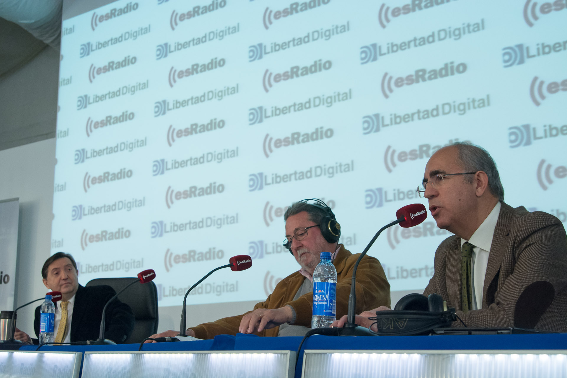 De izquierda a derecha, Federico Jiménez Losantos, Pedro de Tena y Paco Rosell durante la emisión en directo de Es la Mañana de Federico en Sevilla