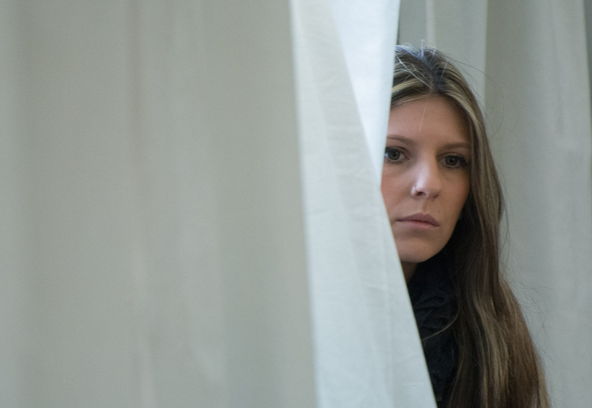 Una joven se asoma al interior del auditorio a través de la cortina de la entrada