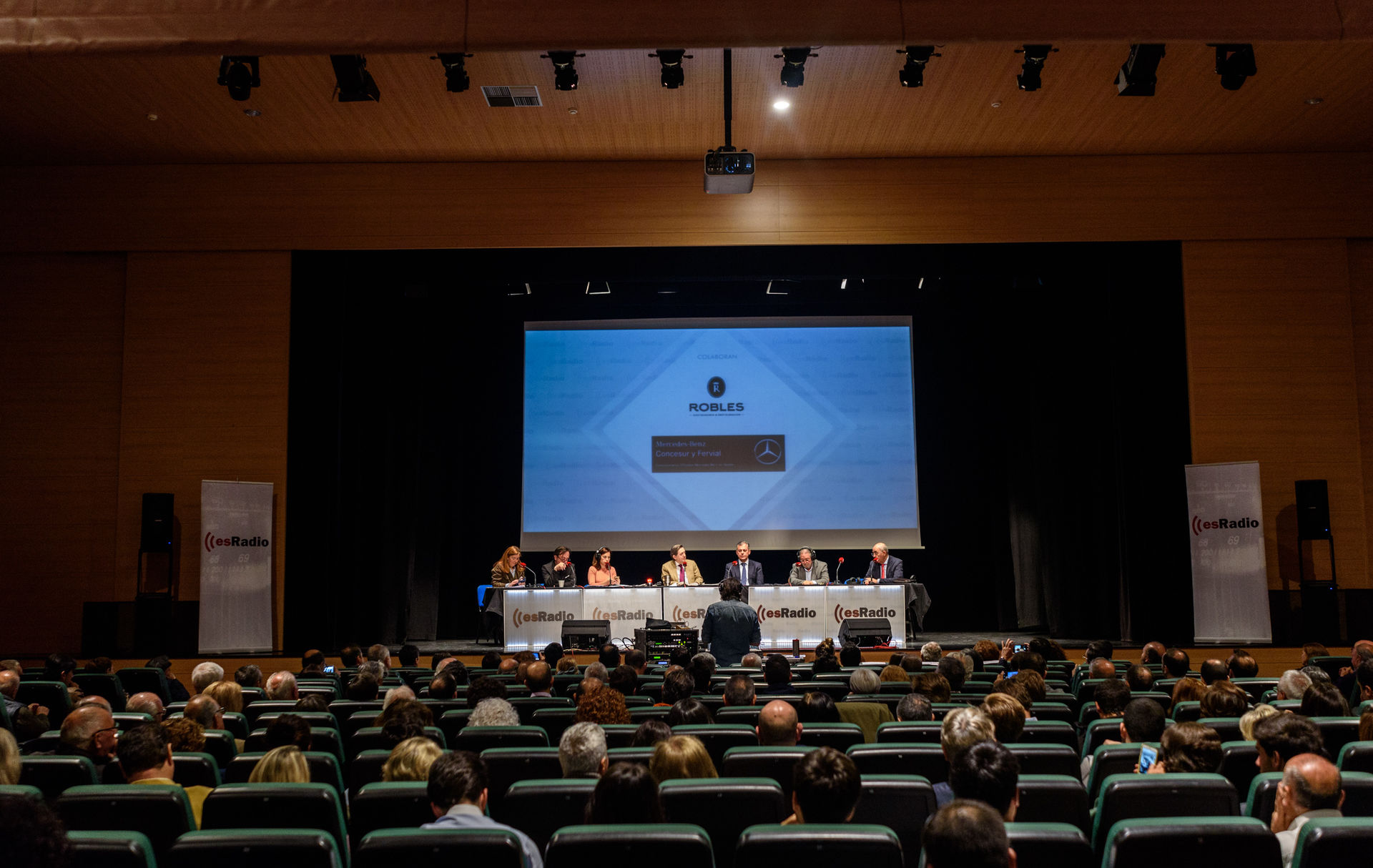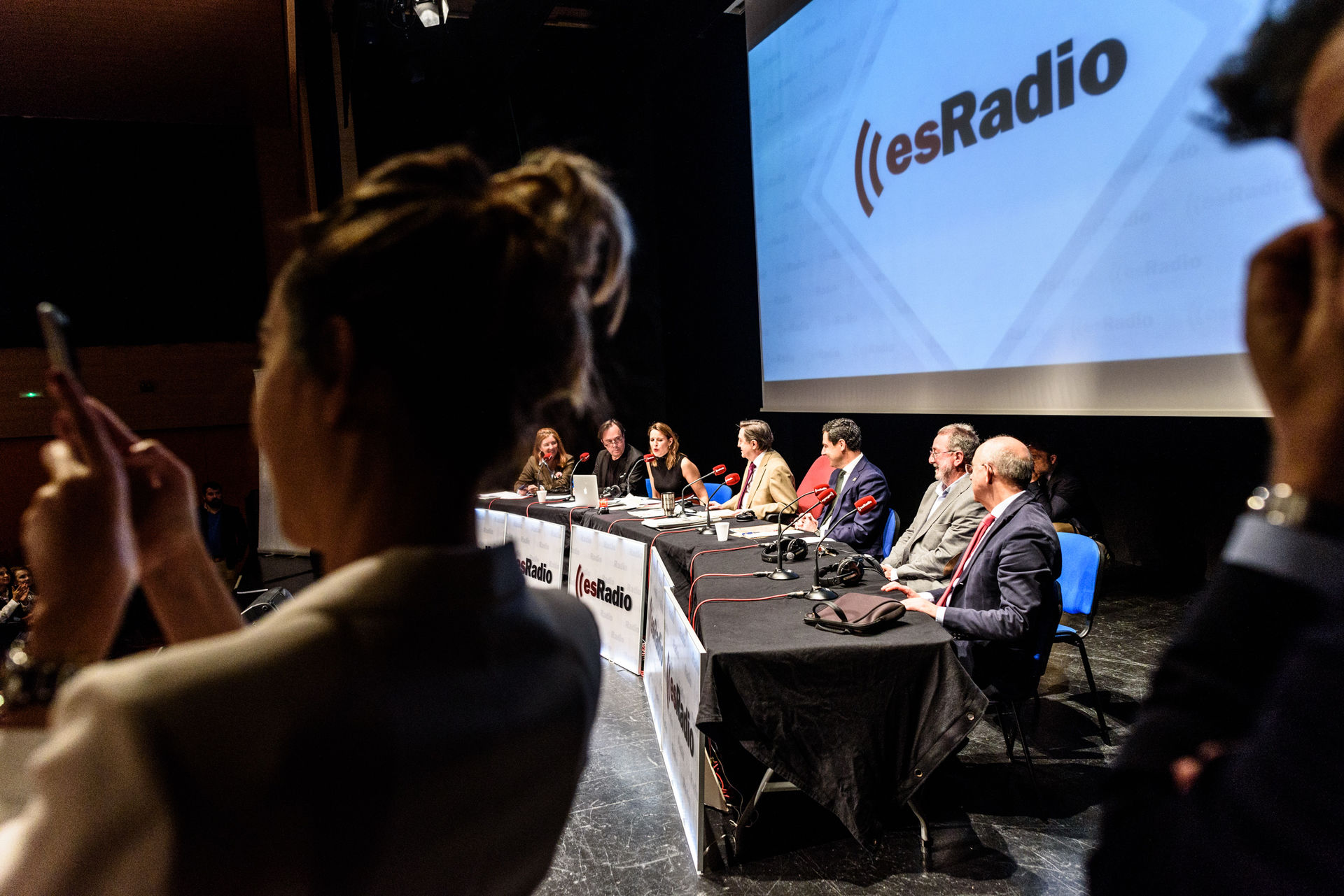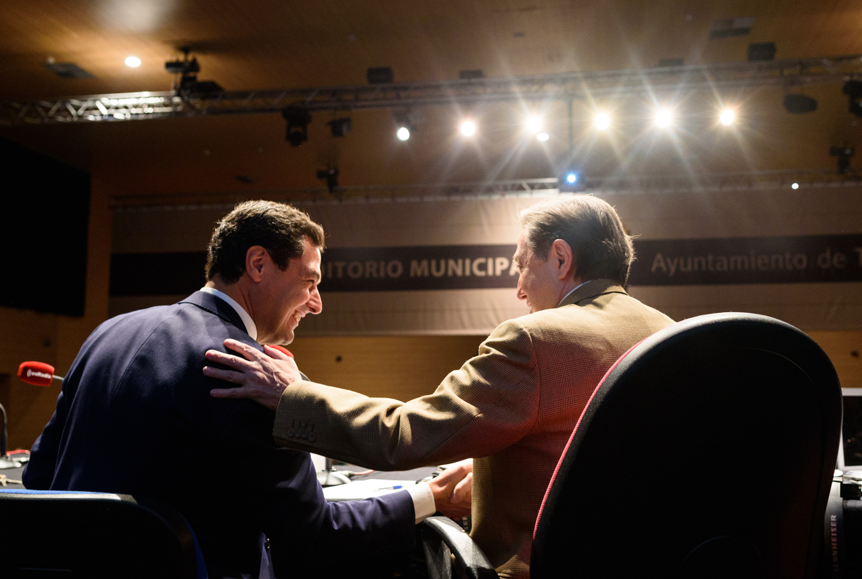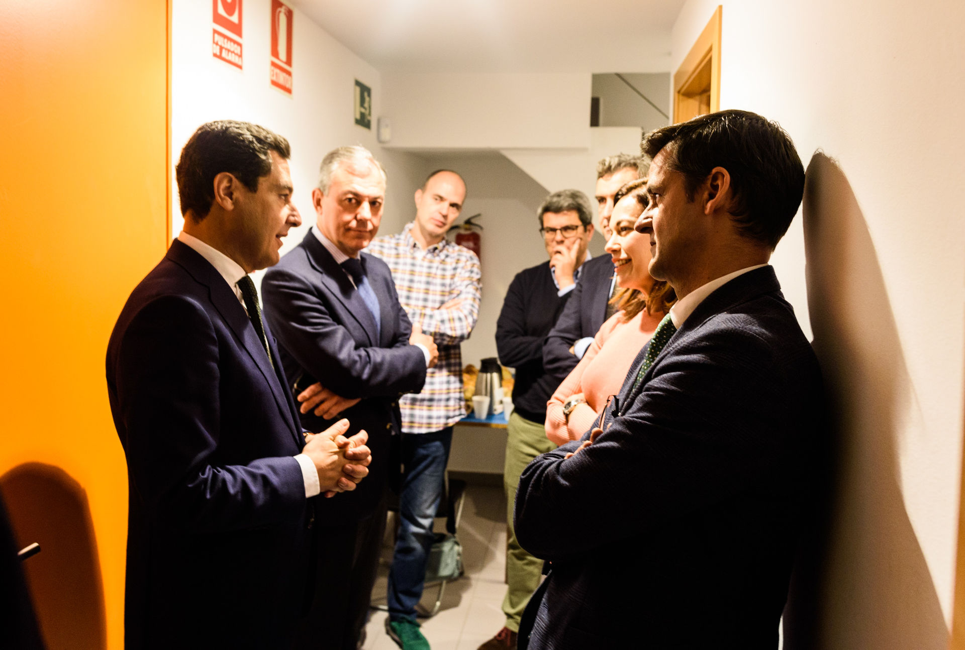 La mesa al completo de la tertulia política junto con el presidente de la Junta de Andalucía, Juanma Moreno Bonilla.
