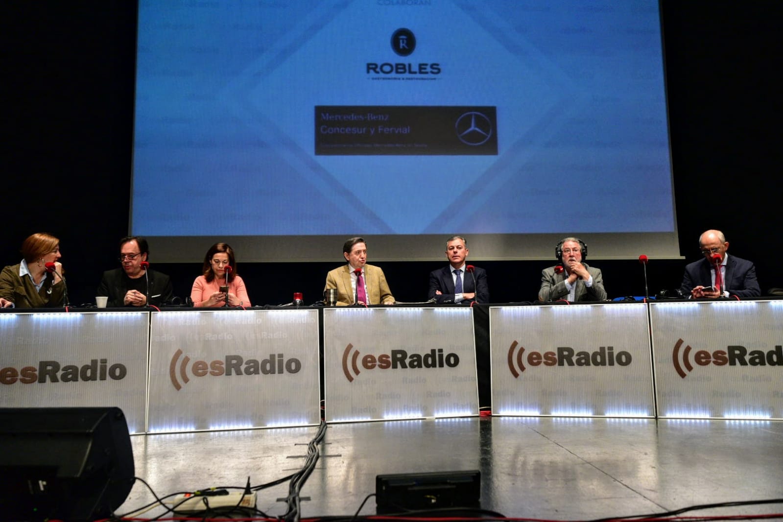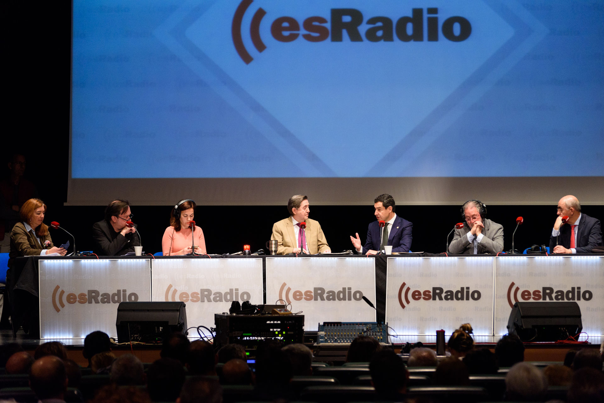 La mesa al completo de la tertulia política junto con el presidente de la Junta de Andalucía, Juanma Moreno Bonilla.