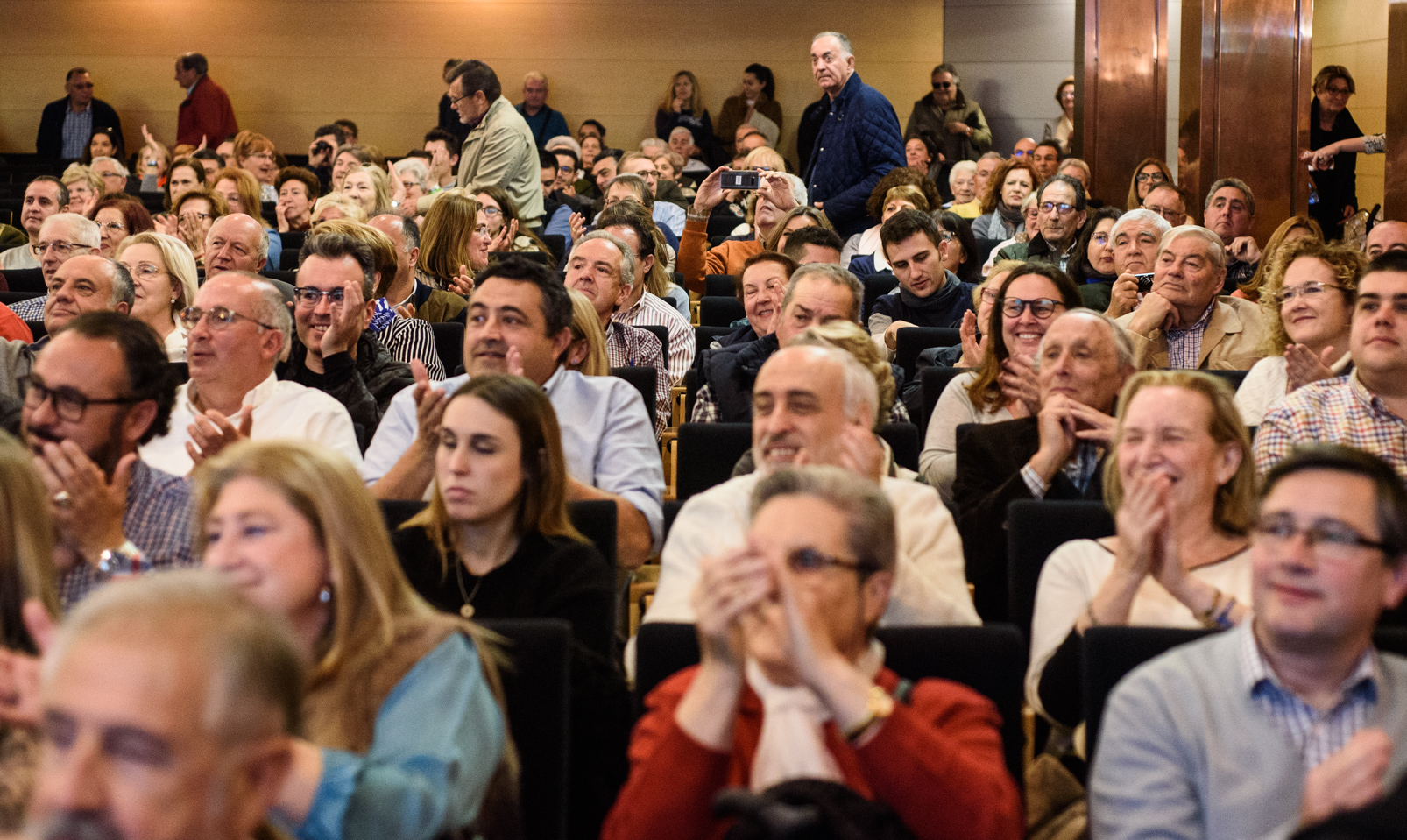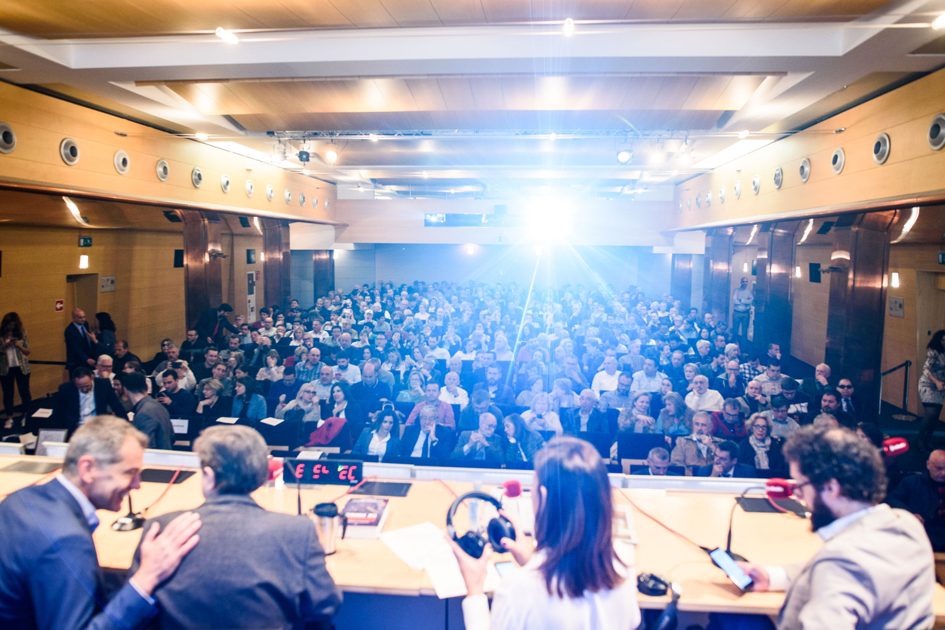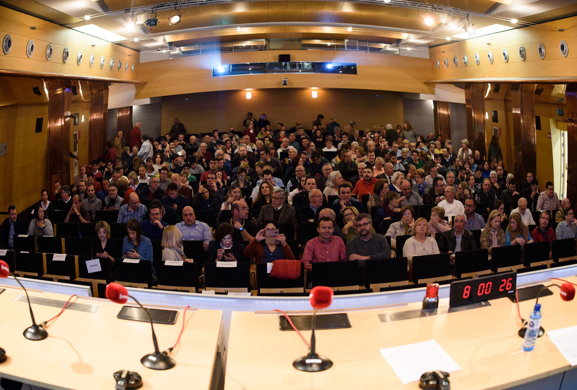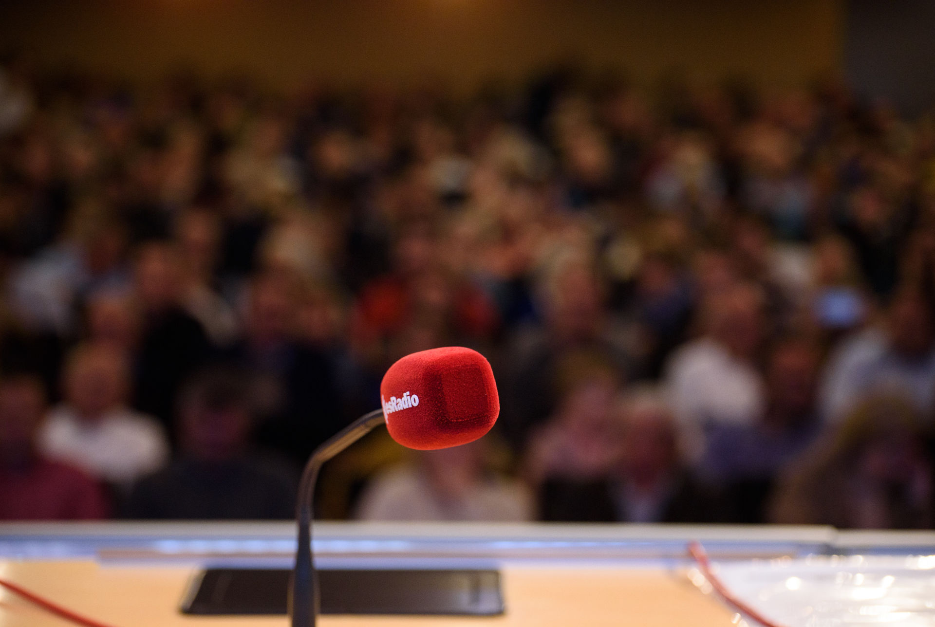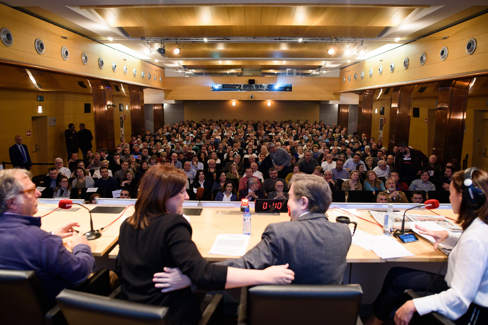 Una vista general del auditorio repleto de público desde la mesa del programa, durante una pausa para publicidad.