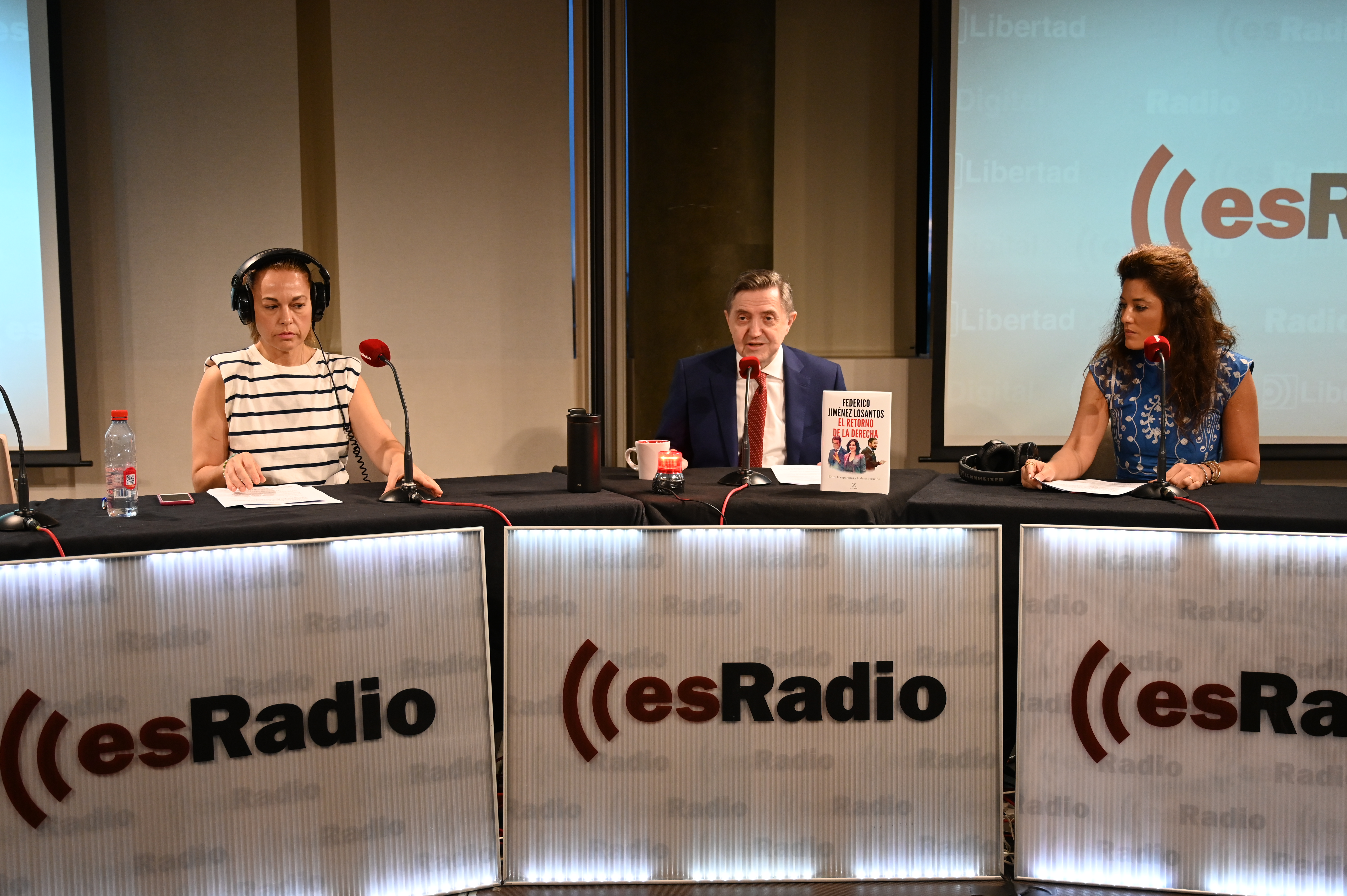 Sara Sanz, Federico Jiménez Losantos y Silvia Riveiro en un momento de la emisión de Es la Mañana desde el auditorio del Hotel Occidental Murcia Agalia.