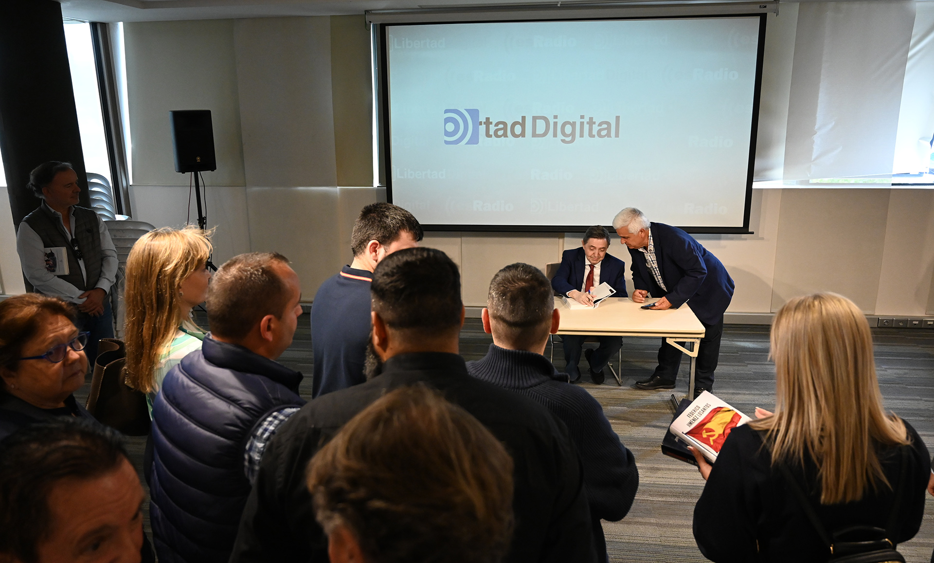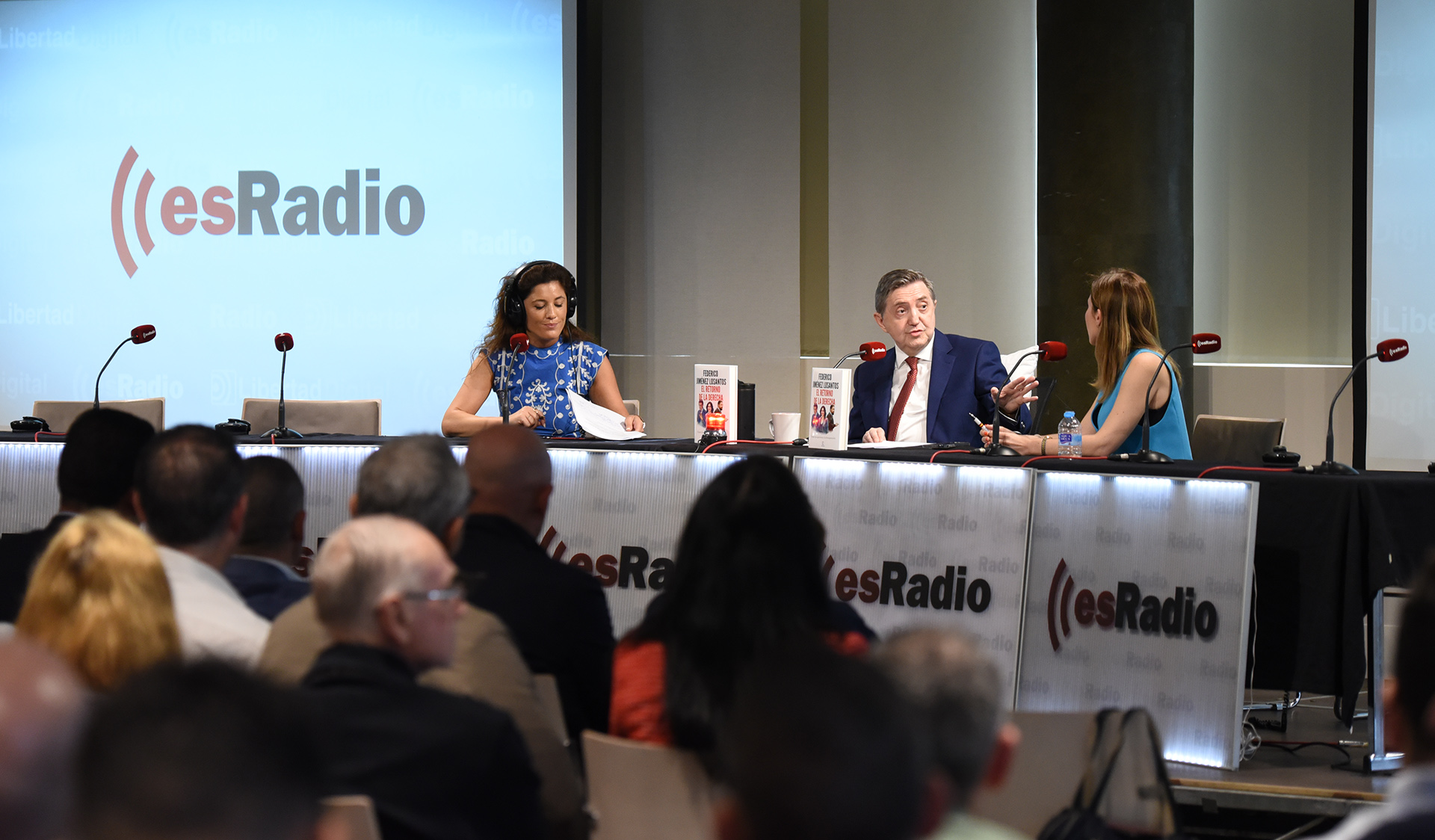 Programa especial de Es la Mañana de Federico desde Murcia. Vista panorámica del auditorio del Hotel Occidental Murcia Agalia. En la mesa, Sara Sanz, Federico Jiménez Losantos y Silvia Riveiro.