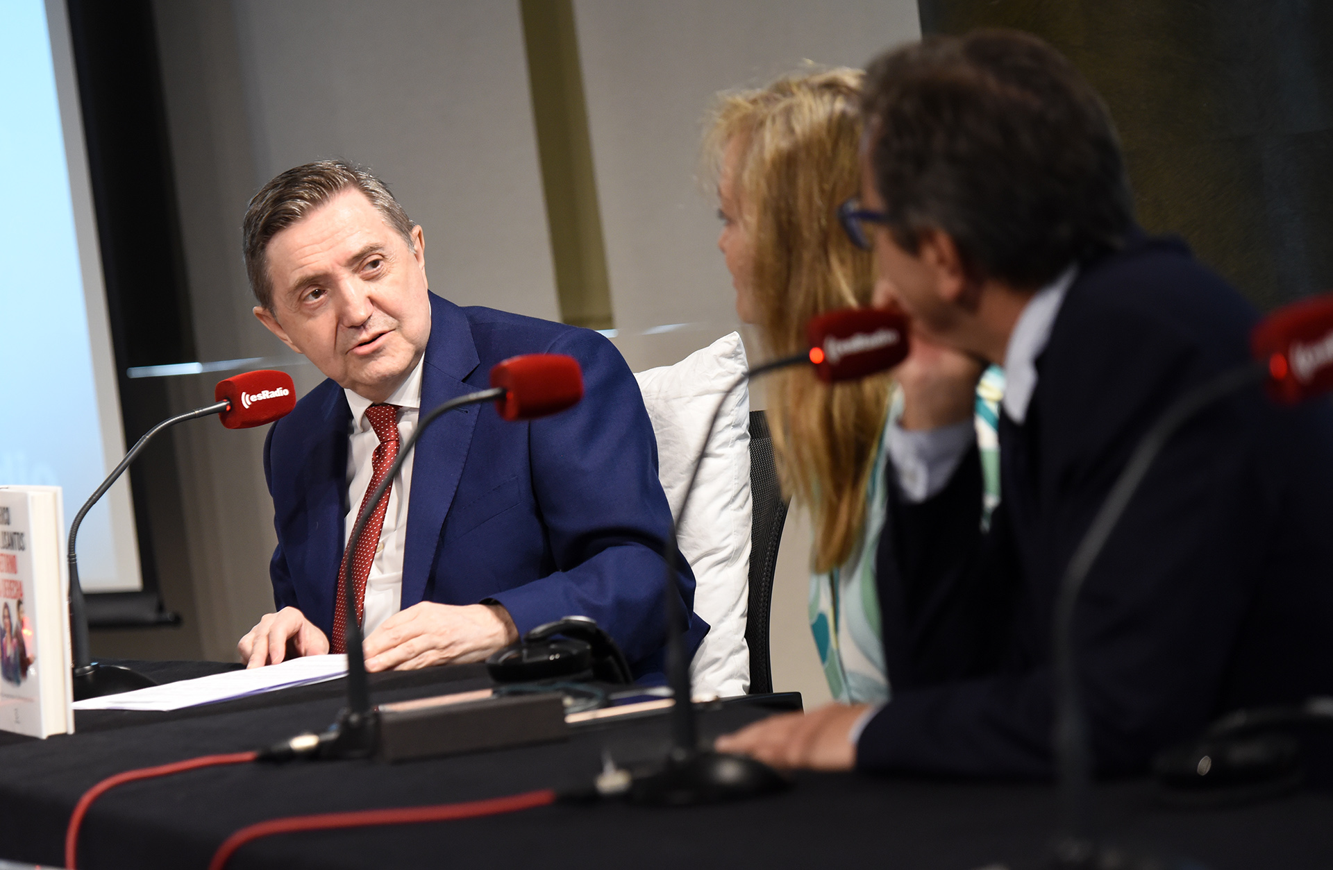 Federico Jiménez Losantos, Ignacia de Pano y José Alejandro Vara durante la tertulia de Es la Mañana emitida en directo desde el auditorio del Hotel Occidental Murcia Agalia.