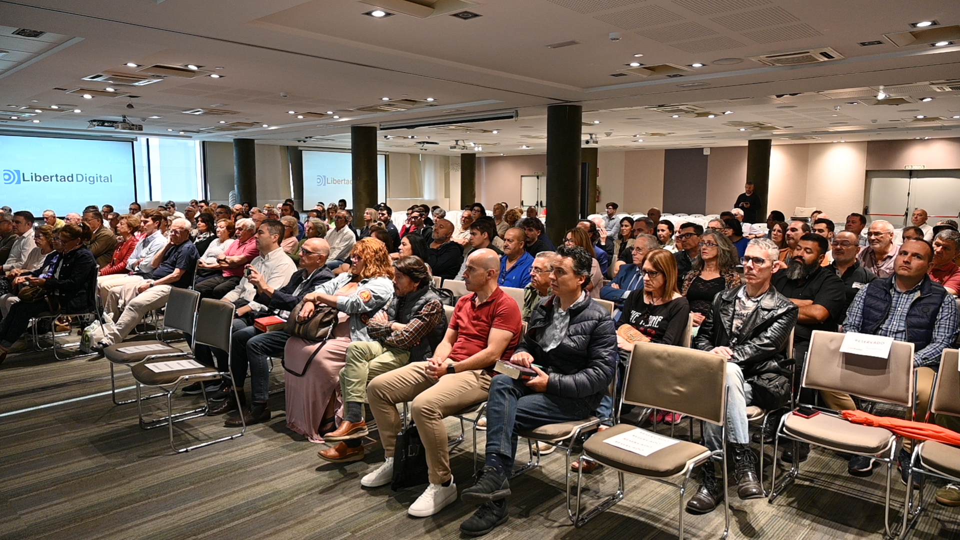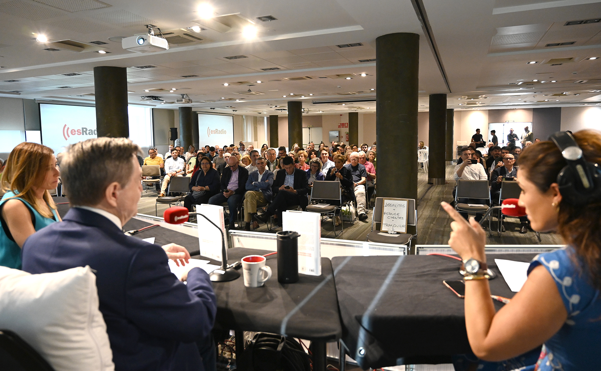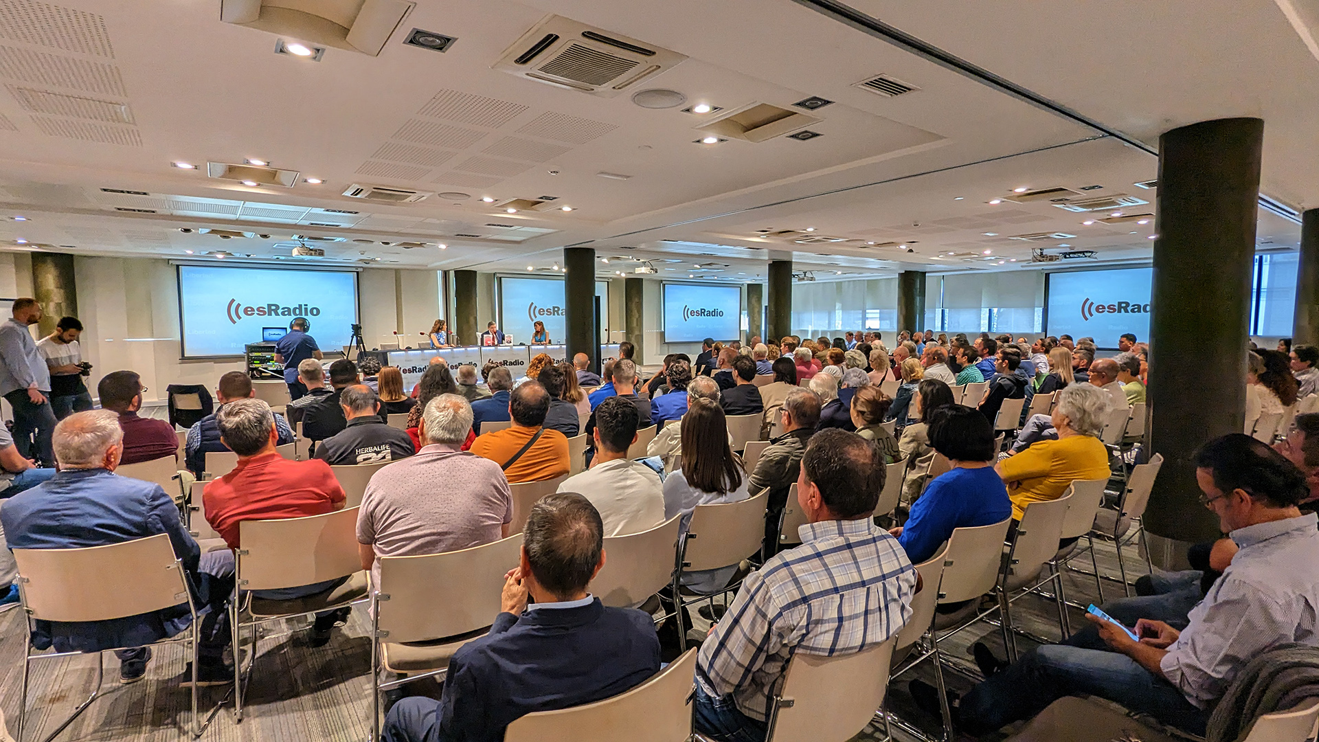 Vista desde atrás del auditorio del Hotel Occidental Murcia Agalia. El público asiste con interés a la emisión de Es la Mañana de Federico. Al fondo, Sara Sanz, Federico Jiménez Losantos y Silvia Riveiro.