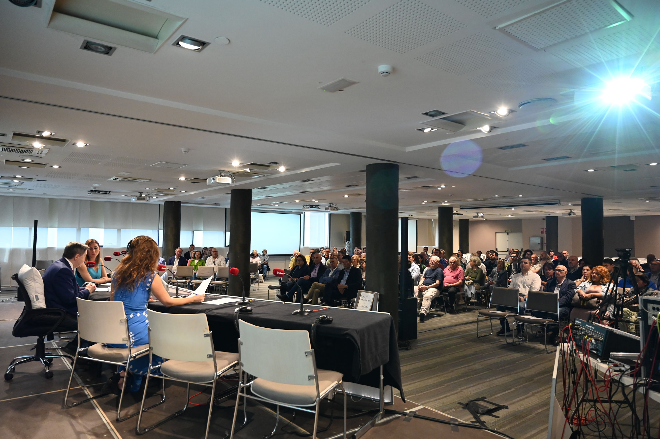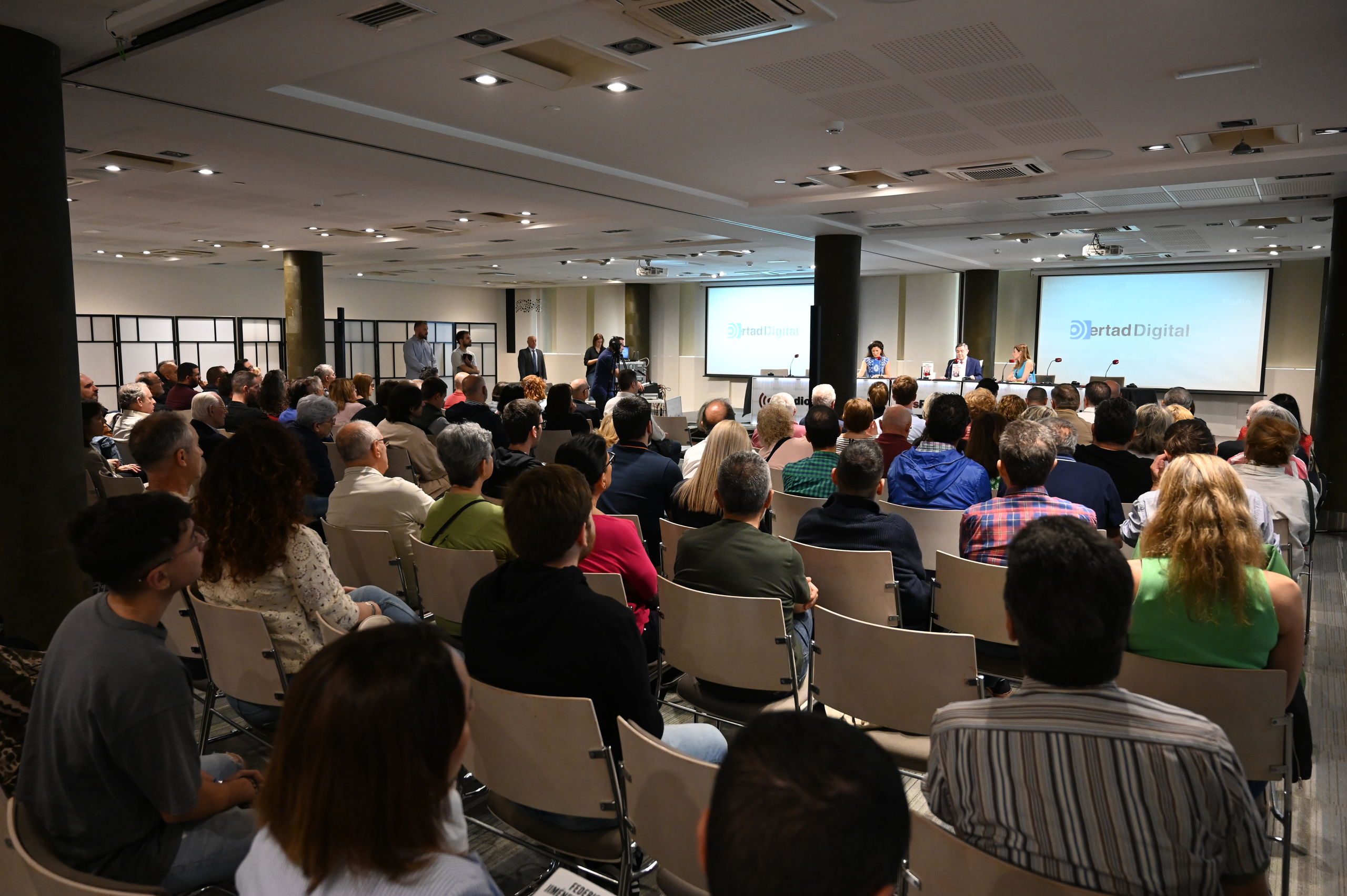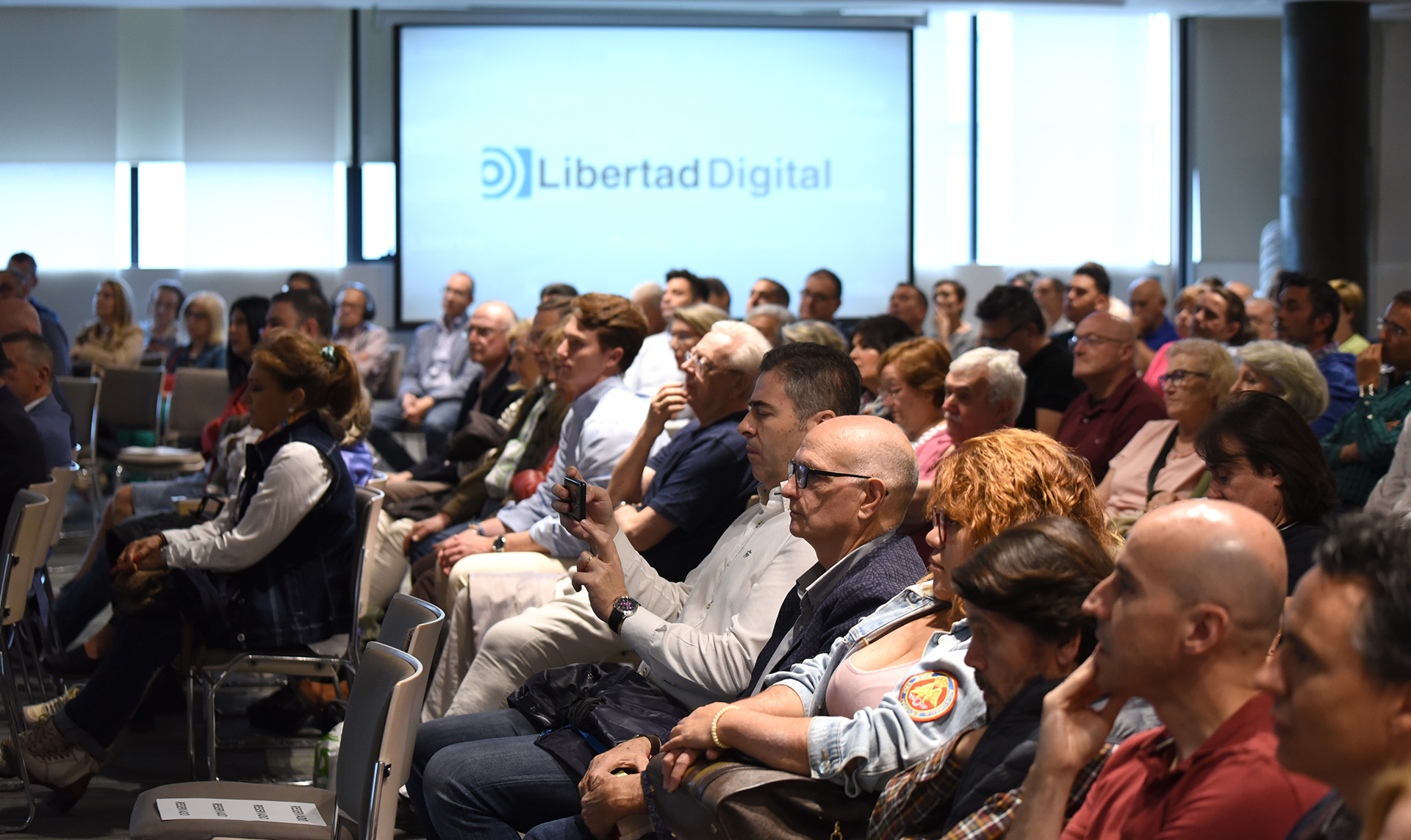 Vista desde atrás del auditorio del Hotel Occidental Murcia Agalia. El público asiste con interés a la emisión de Es la Mañana de Federico. Al fondo, Sara Sanz, Federico Jiménez Losantos y Silvia Riveiro.