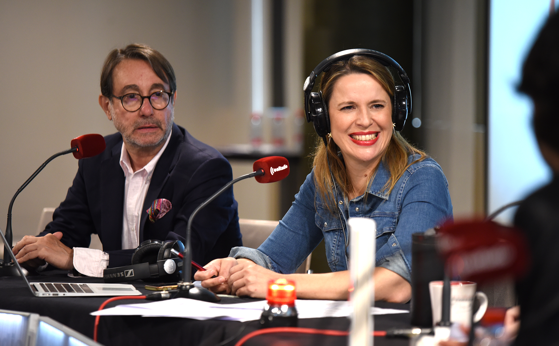 Federico Jiménez Losantos y Natalia Corbalán, de la Fundación Ingenio —que agrupa a más de 45 cooperativas y empresas agrícolas del campo de Cartagena— durante la emisión de Es la Mañana desde el auditorio del Hotel Occidental Murcia Agalia.