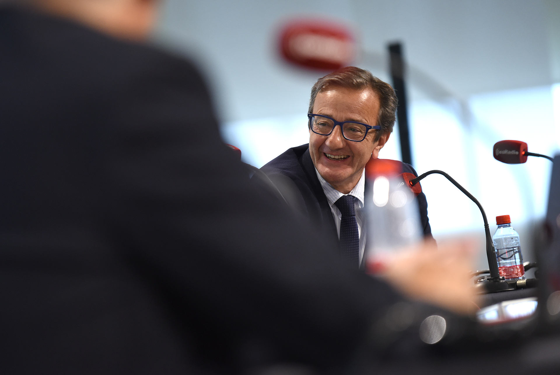 Primer plano de Federico Jiménez Losantos durante la emisión de Es la Mañana desde el auditorio del Hotel Occidental Murcia Agalia.