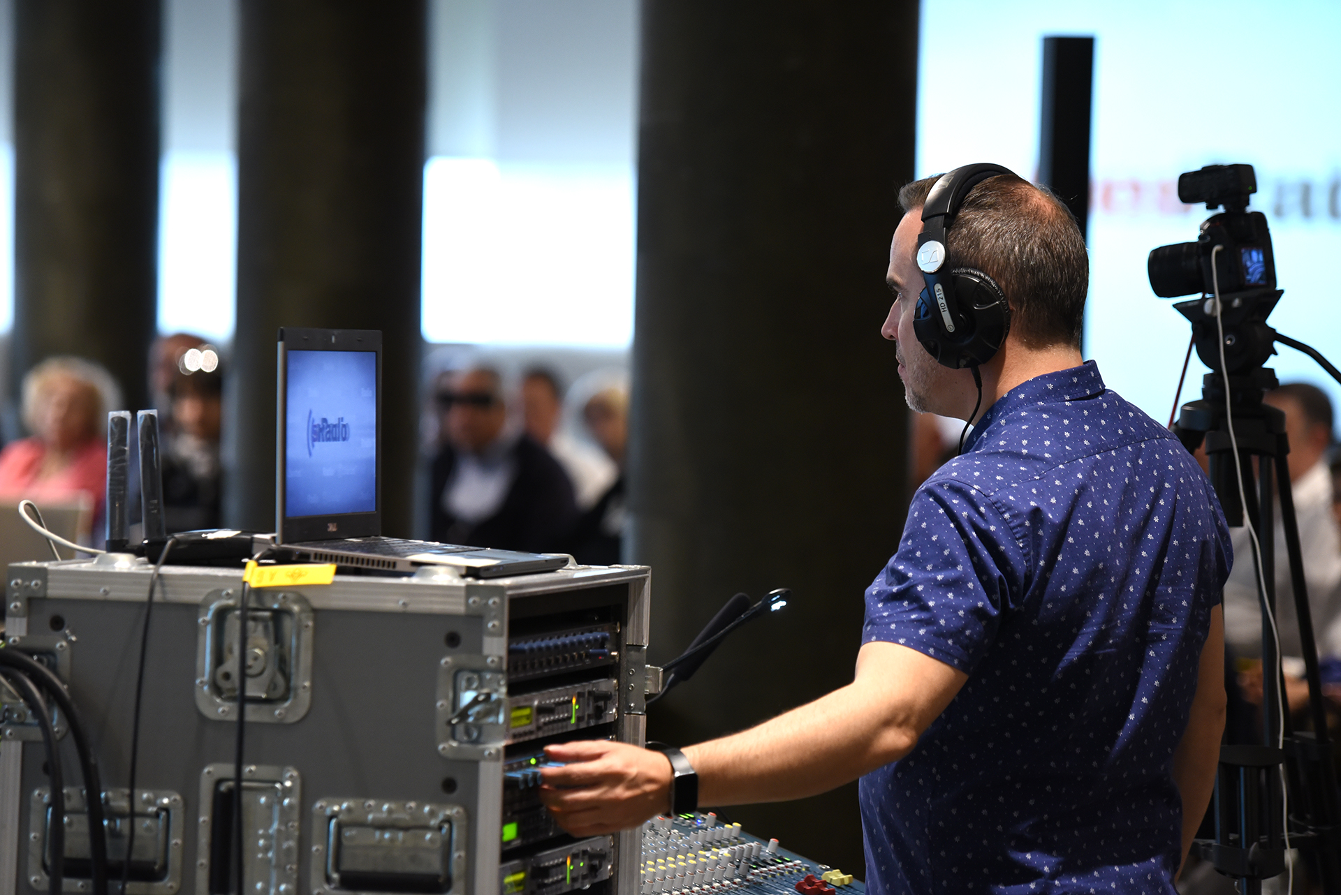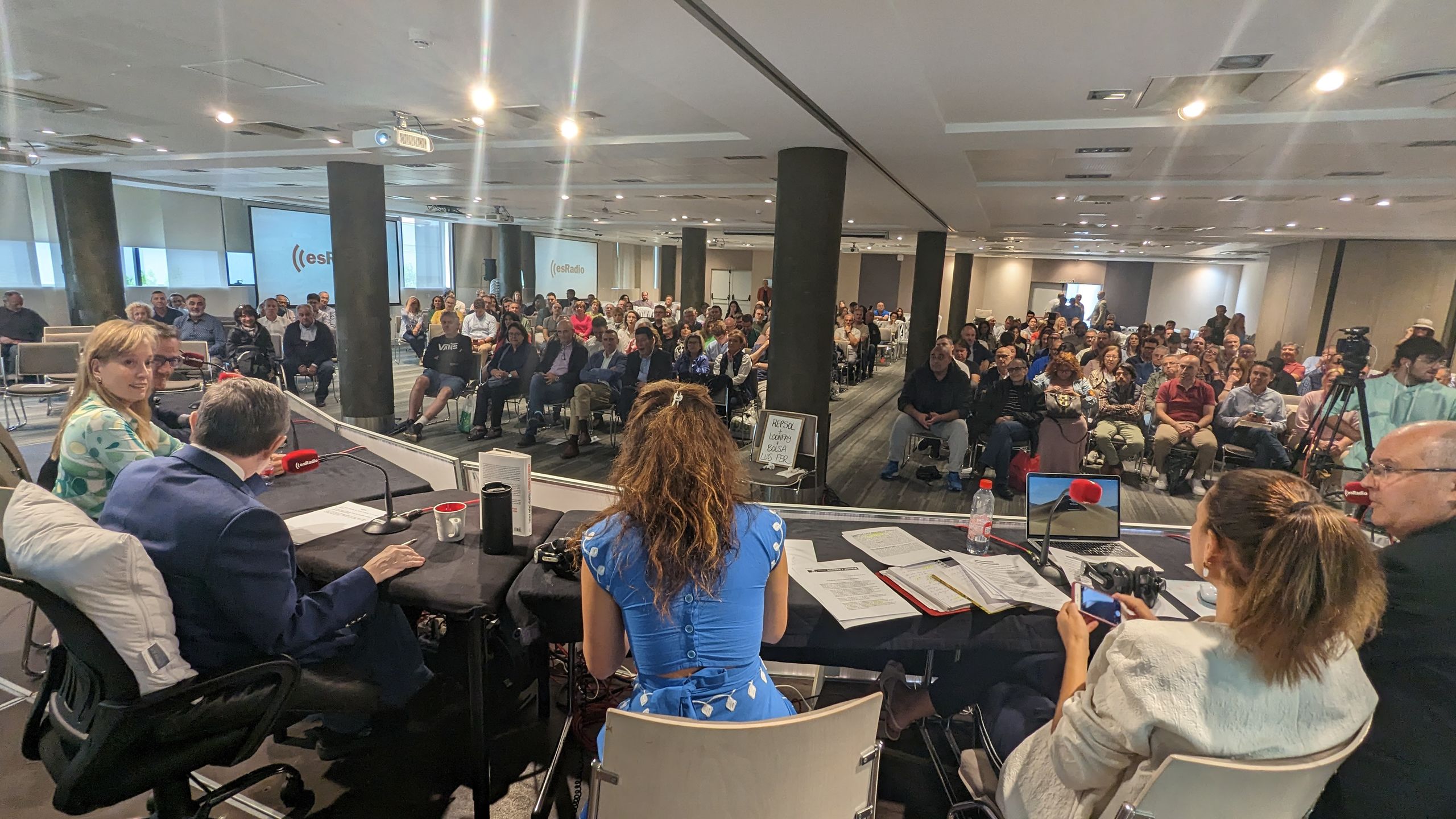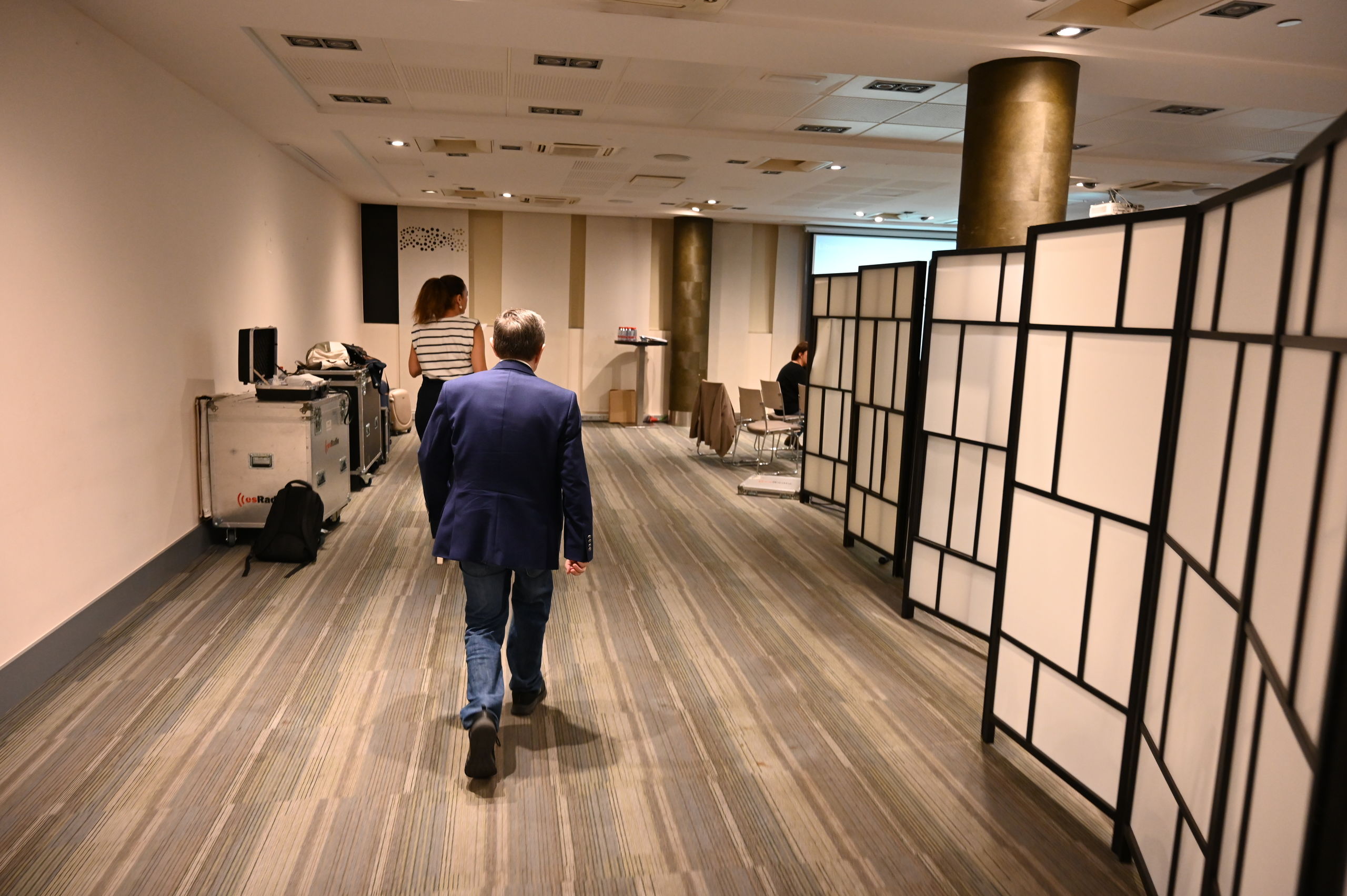 El auditorio del hotel y la mesa del programa desde otro punto de vista, detrás de las cámaras.