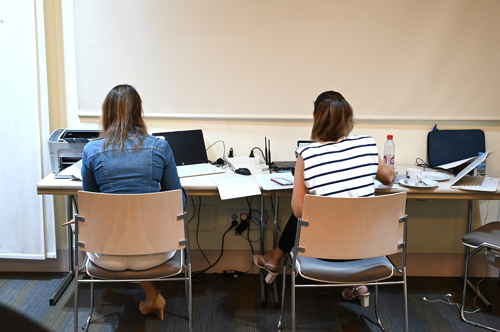 Isabel González y Rosana Laviada, trabajando y preparado el programa varias horas antes del comienzo del mismo.