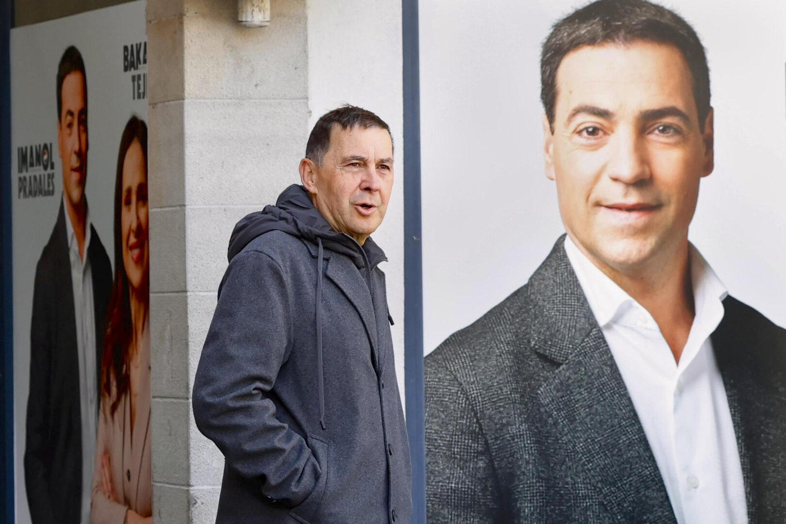 Y ahí está, el coordinador general de EH Bildu, Arnaldo Otegi. Blanqueado por el gobierno socialista y también por el PNV (la carita de Pradales del cartel es un buen reflejo), ahora este siniestro personaje, condenado en su día a seis años por secuestro, puede llevar a su formación a gobernar el País Vasco. | LD/Agencias