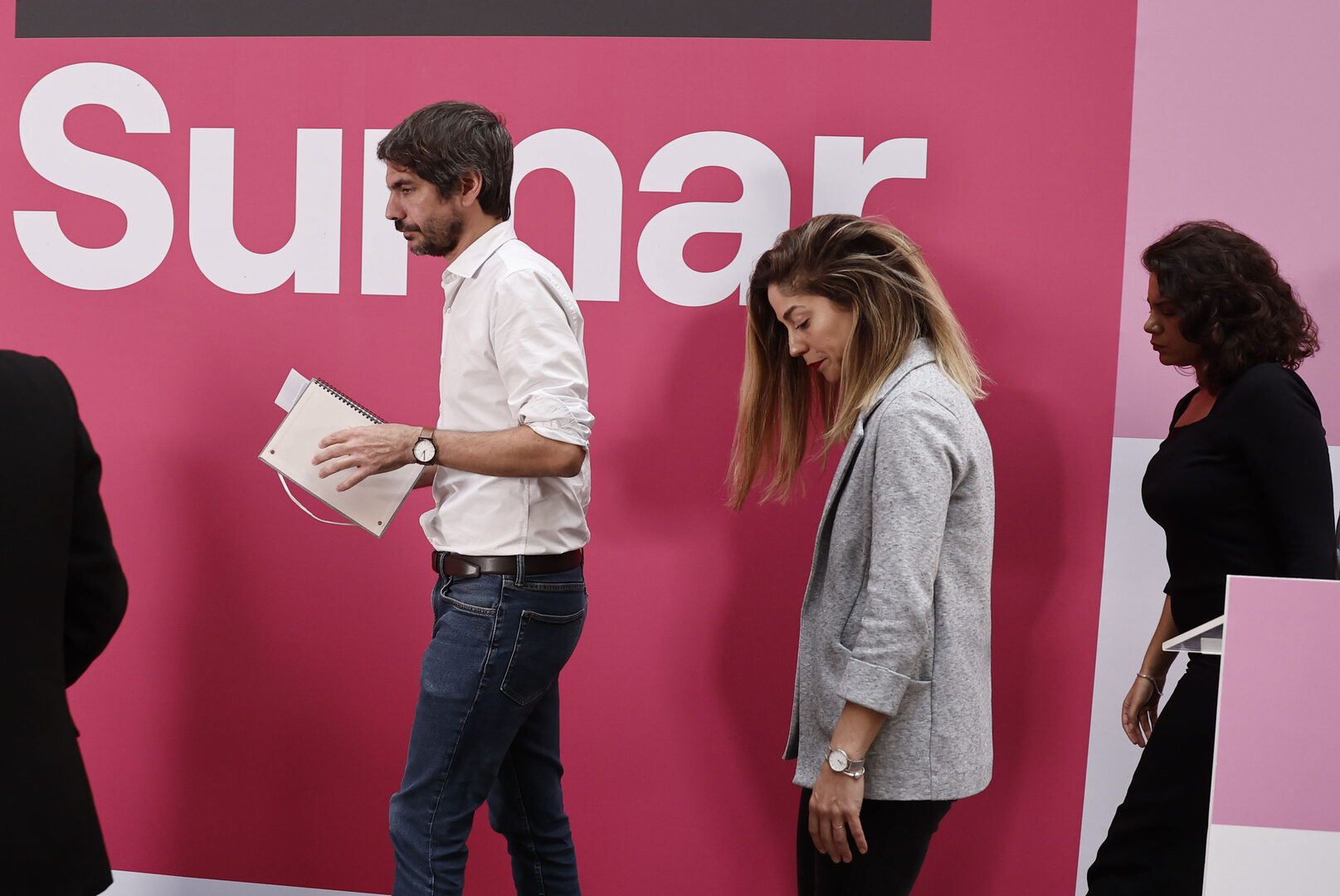 El portavoz de Sumar, Ernest Urtasun (i) y la secretaria de Organización, Lara Hernández tras la rueda de prensa para anunciar las decisiones de la Ejecutiva, este sábado. | EFE/Sergio Pérez