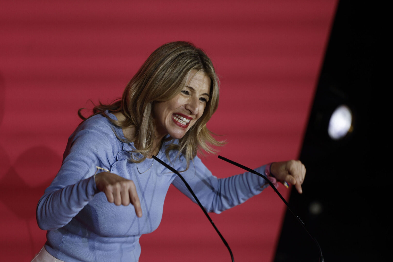 MADRID, 30/03/2025.- La vicepresidenta segunda del Gobierno, Yolanda Díaz, durante su intervención en la clausura de la Asamblea general de Sumar, este domingo en Madrid. EFE/Sergio Pérez | EFE