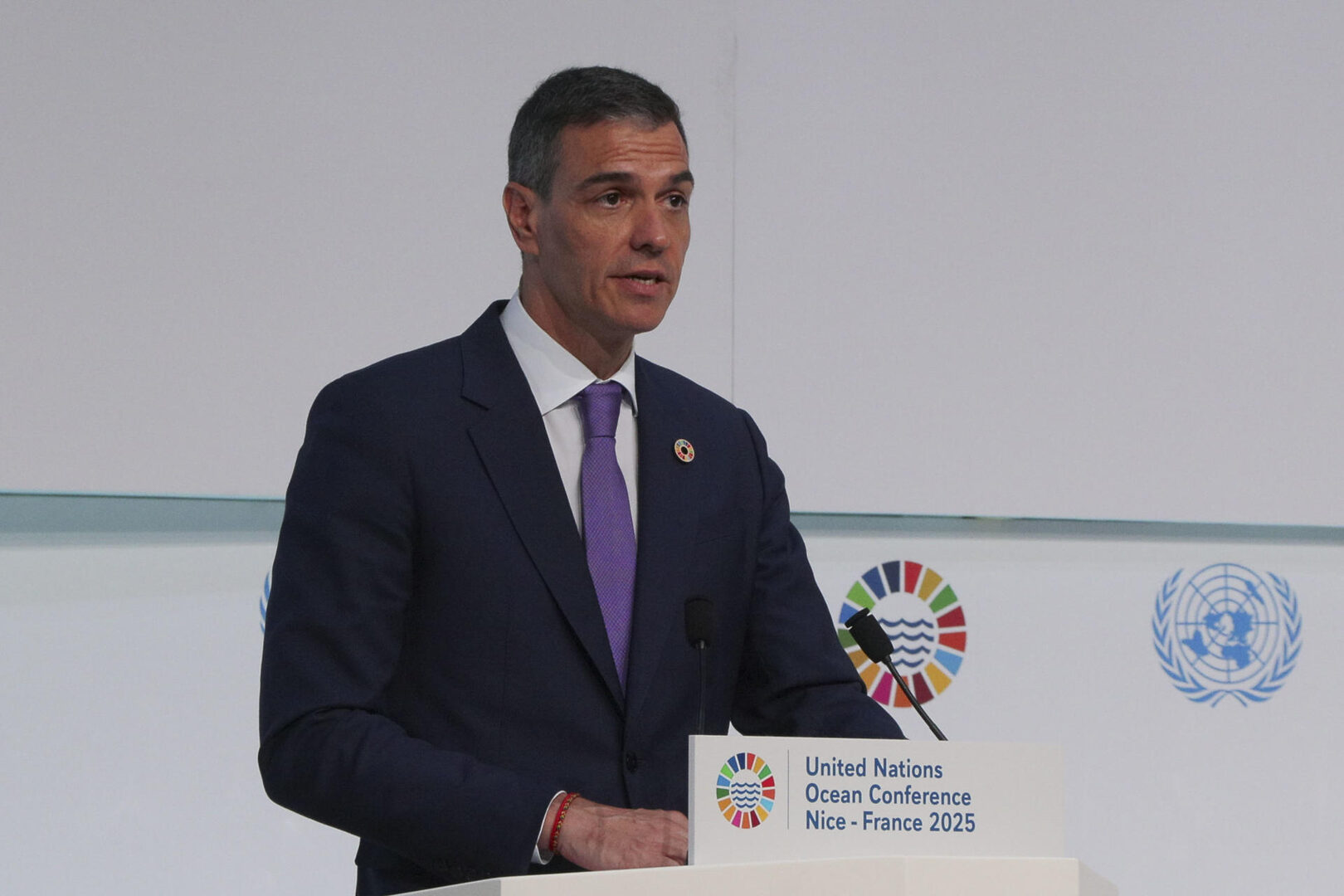 NIZA, 09/06/2025.- El presidente del Gobierno de España, Pedro Sánchez, participa en un acto sobre el Pacto europeo de los Océanos, con motivo de la Cumbre de la ONU sobre los Océanos, que tiene lugar en la ciudad francesa de Niza. El gran ausente en la tercera Cumbre de la ONU sobre los Océanos de Niza, el presidente estadounidense Donald Trump, ha sido el blanco de críticas por parte de ciertos líderes mundiales debido a sus planes expansionistas y su intención de explotar la minería en el fondo del mar. EFE/ Edgar Sapiña Manchado | EFE