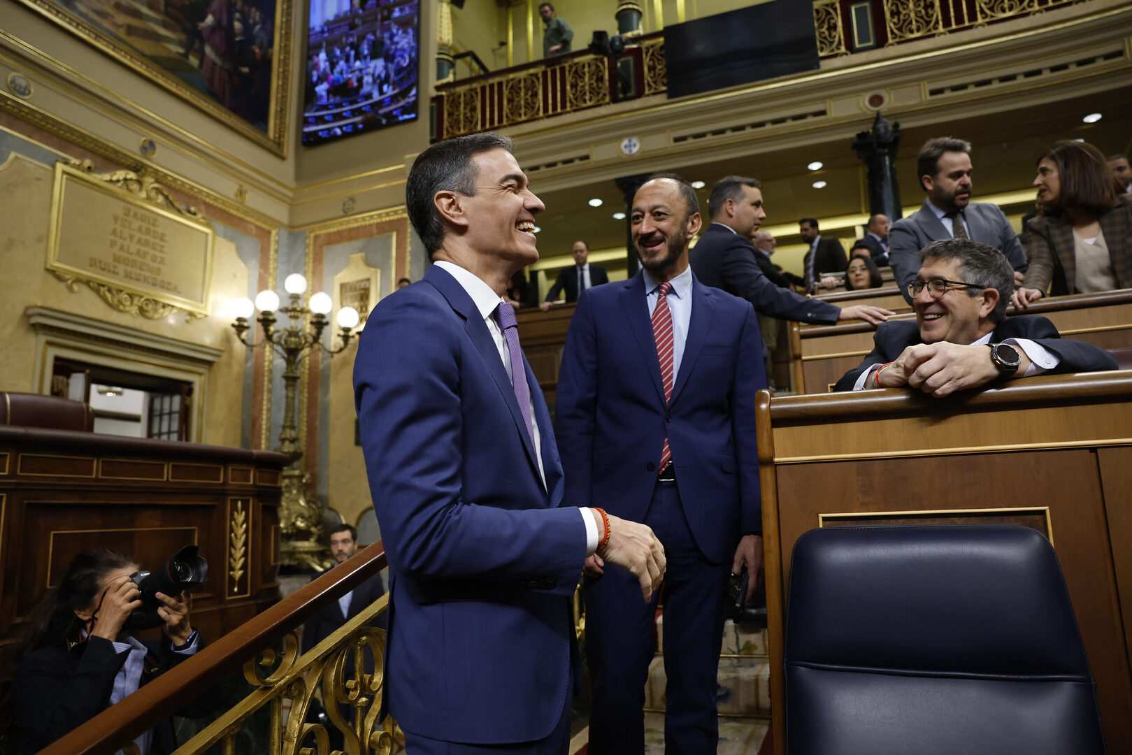 El presidente del Gobierno, Pedro Sánchez, conversa con el portavoz socialista en el Congreso, Patxi López, y el vicepresidente primero de la Mesa del Congreso, Alfonso Rodríguez Gómez de Celis. | EFE