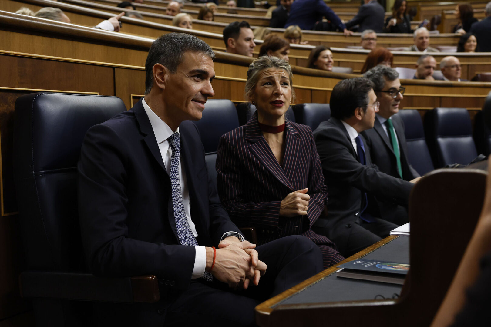 El presidente del Gobierno, Pedro Sánchez, conversa con la vicepresidenta segunda y ministra de Trabajo, Yolanda Díaz, antes de la sesión de control al Gobierno en el Congreso. | EFE