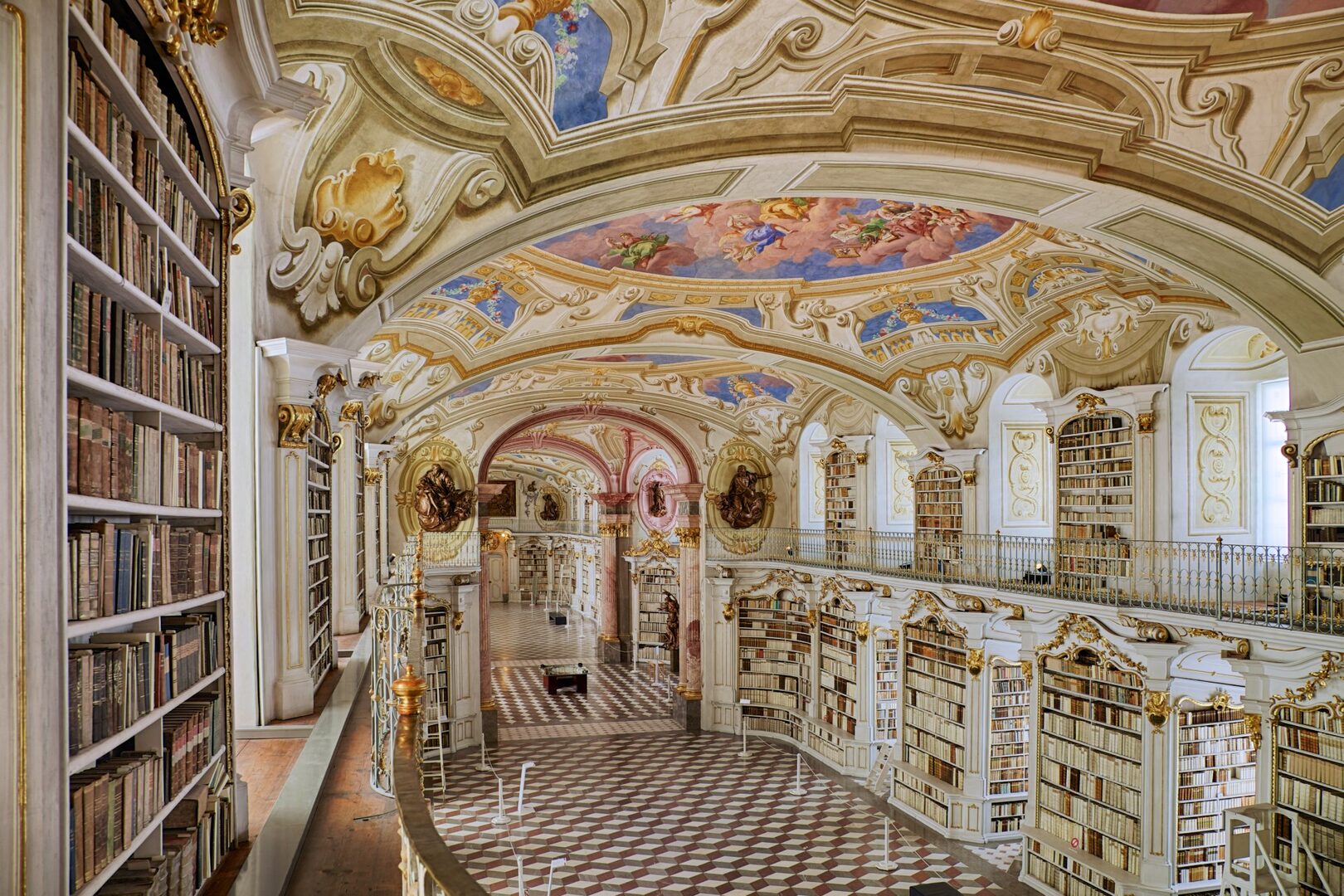 Construida en 1776, es la mayor biblioteca que hay en cualquier monasterio del mundo, albergando 70.000 volúmenes de los 200.000 que posee la abadía. Los libros de la colección original fueron encuadernados de nuevo en blanco para ajustarse al resto de la decoración y las esculturas, que parecen de bronce, en realidad son de madera. | Flickr/CC/Gottfried Maurer