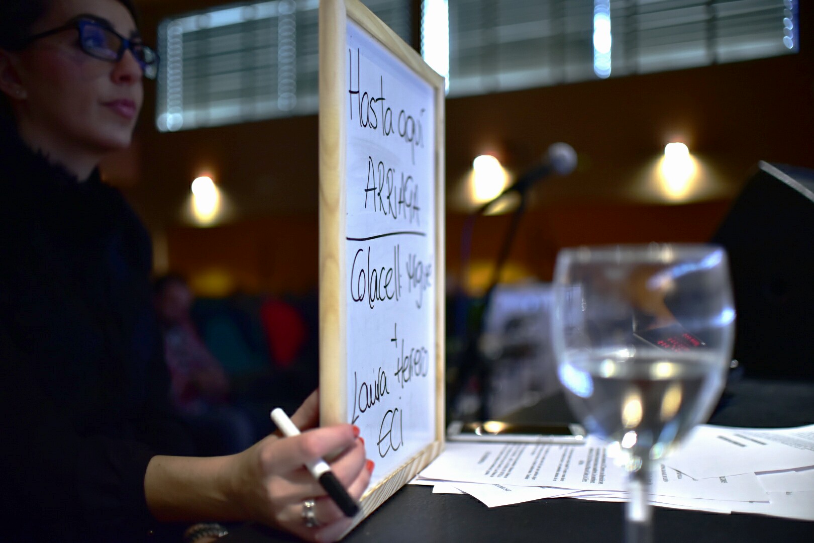 La productora del programa, María Vélez, sostiene una pizarra con las indicaciones para Federico Jiménez Losantos