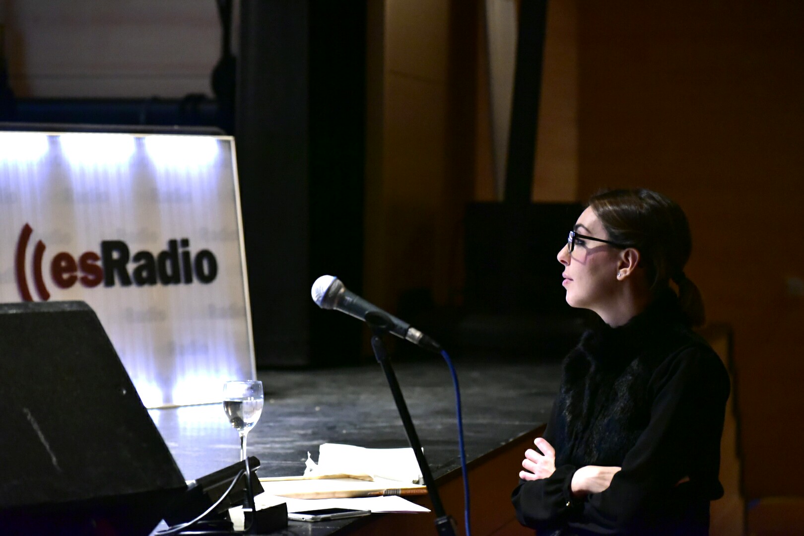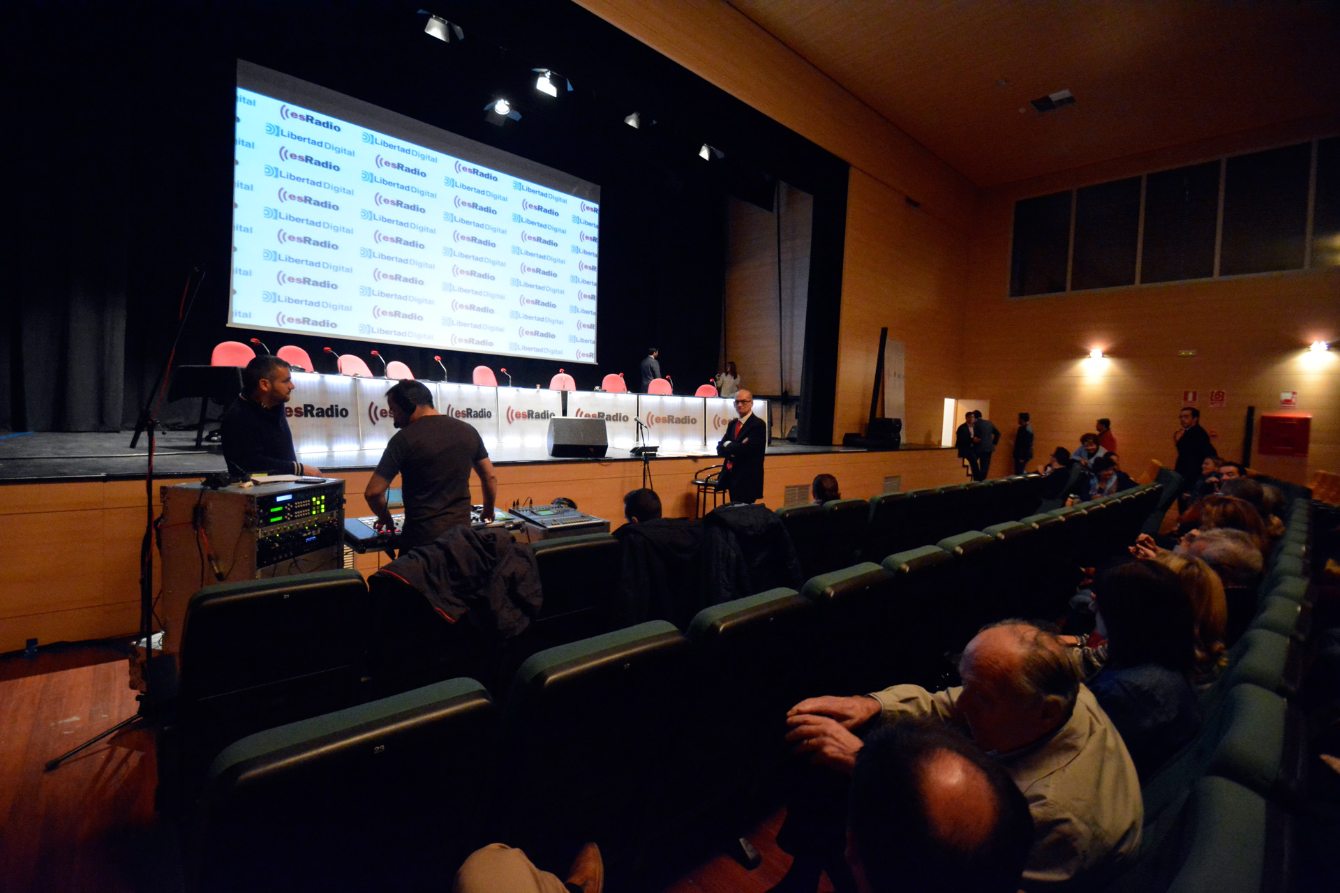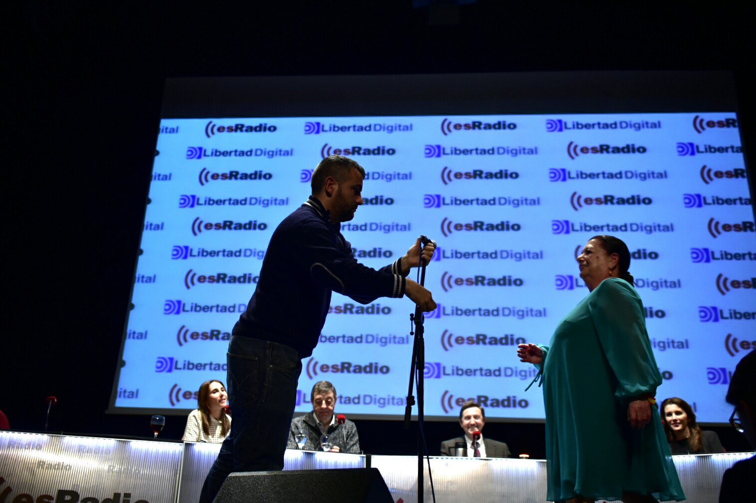 El técnico de esRadio Faustino coloca el micrónfono para que Carmen Jara interprete su ya célebre 'En tierra extraña'que puso en pie al auditorio