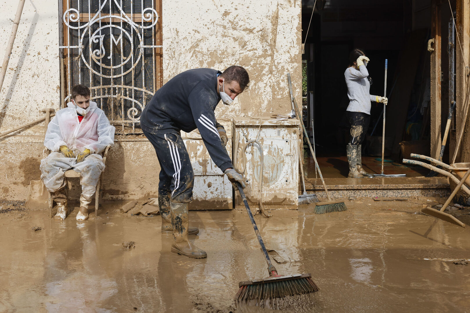 Voluntarios barren el lodo de una calle de Masanasa, Valencia, este jueves. | EFE