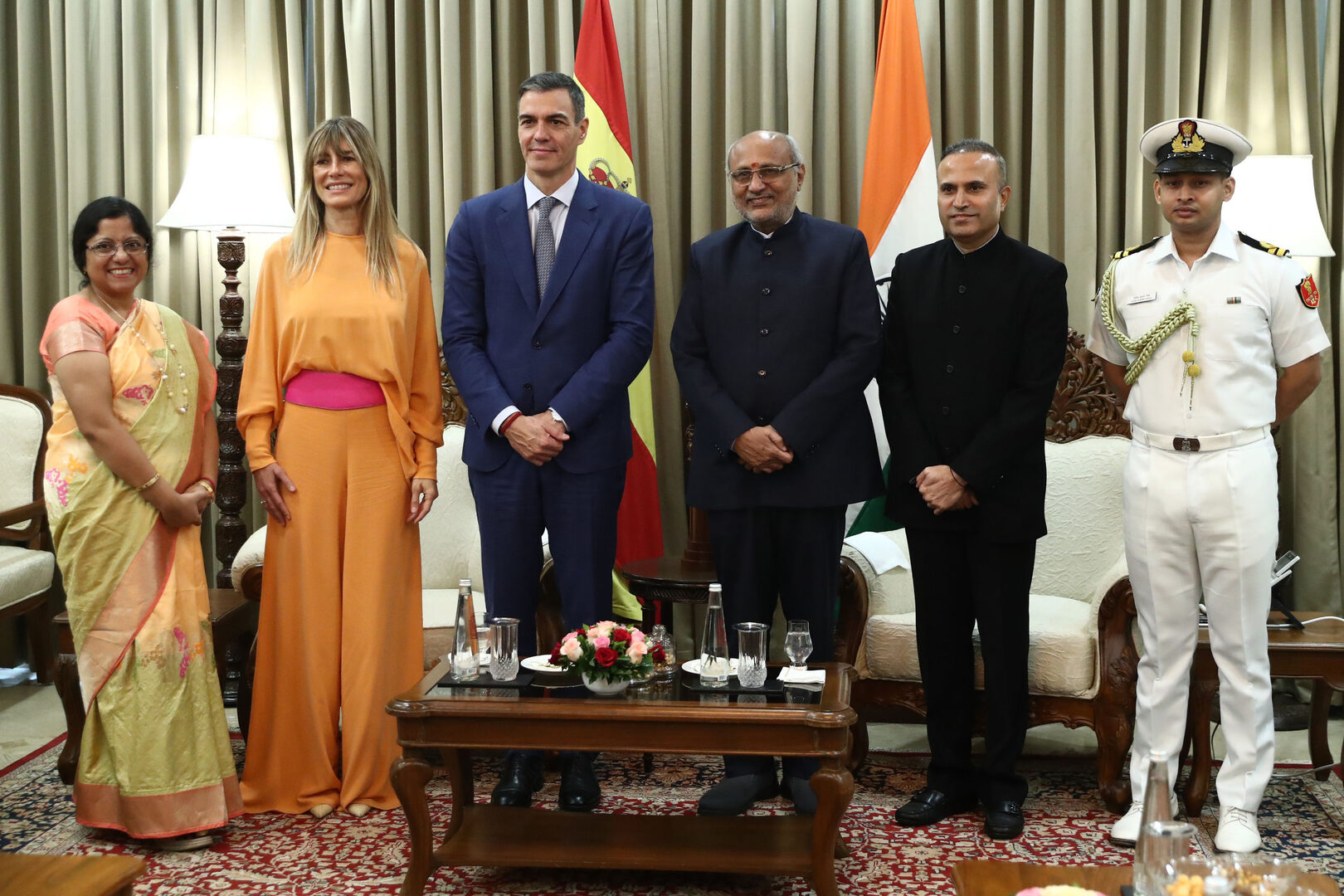 El presidente del Gobierno, Pedro Sánchez (3i), junto a su esposa Begoña Gómez (2i), durante un encuentro con el gobernador del Estado de Maharashtra, Shri C.P. Radhakrishnan (3i), en la residencia oficial del gobernador, en Bombay este martes. | EFE/Moncloa/Fernando Calvo