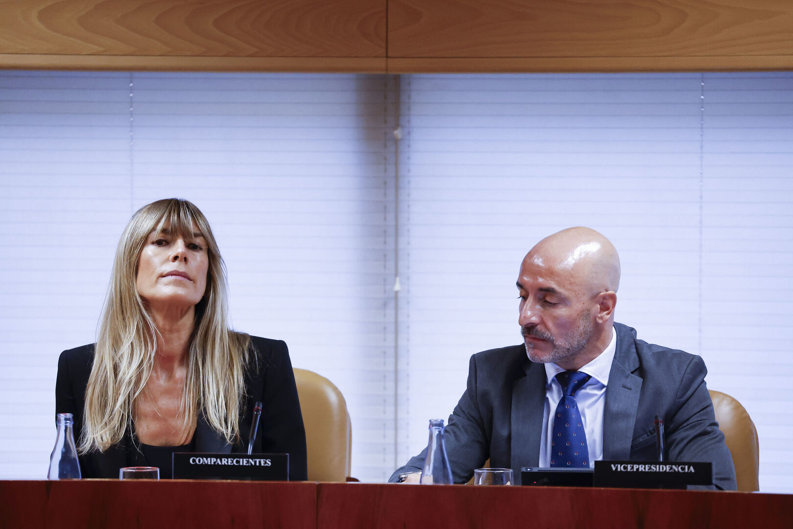 Begoña Gómez (i), esposa del presidente del gobierno Pedro Sánchez, sentada al lado del político socialista Jesús Celada, vicepresidente de la comisión de investigación impulsada por el PP para dilucidar si tuvo "tratos de favor" por la Universidad Complutense para la creación de su cátedra. | EFE