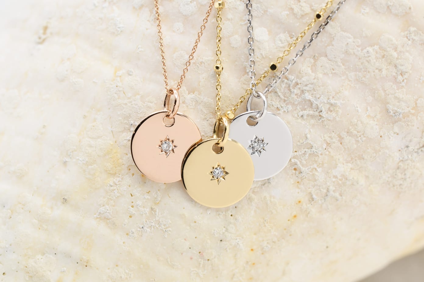 Los colgantes de chapita con engaste estrella. Sencillos y muy ponibles, en ellos se ha recuperado una antigüa forma de sujetar la piedra que hace la figura de una estrellita. Las puedes encontrar en oro amarillo, blanco o rosa, con diamante, rubí, esmeralda, etc y las hay desde 149€.