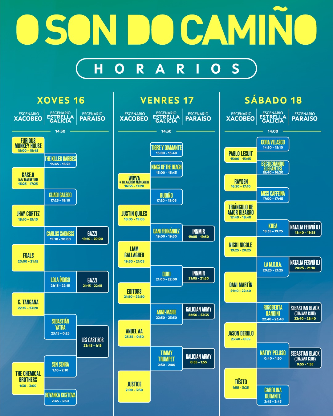 O Son do Camiño iniciará el jueves 16 a las 15,00 con Furious Monkey House. Durante la primera jornada destacan Kase.O (16,25 horas), Jhay Cortez (18,10), Foals (20,00), C.Tangana (22,15), Sebastián Yatra (23,15) y The Chemical Brothers (1,30 horas). El primer día finalizará con la actuación del grupo gallego Boyanka Kostova desde las 2,45 hasta las 3,30.