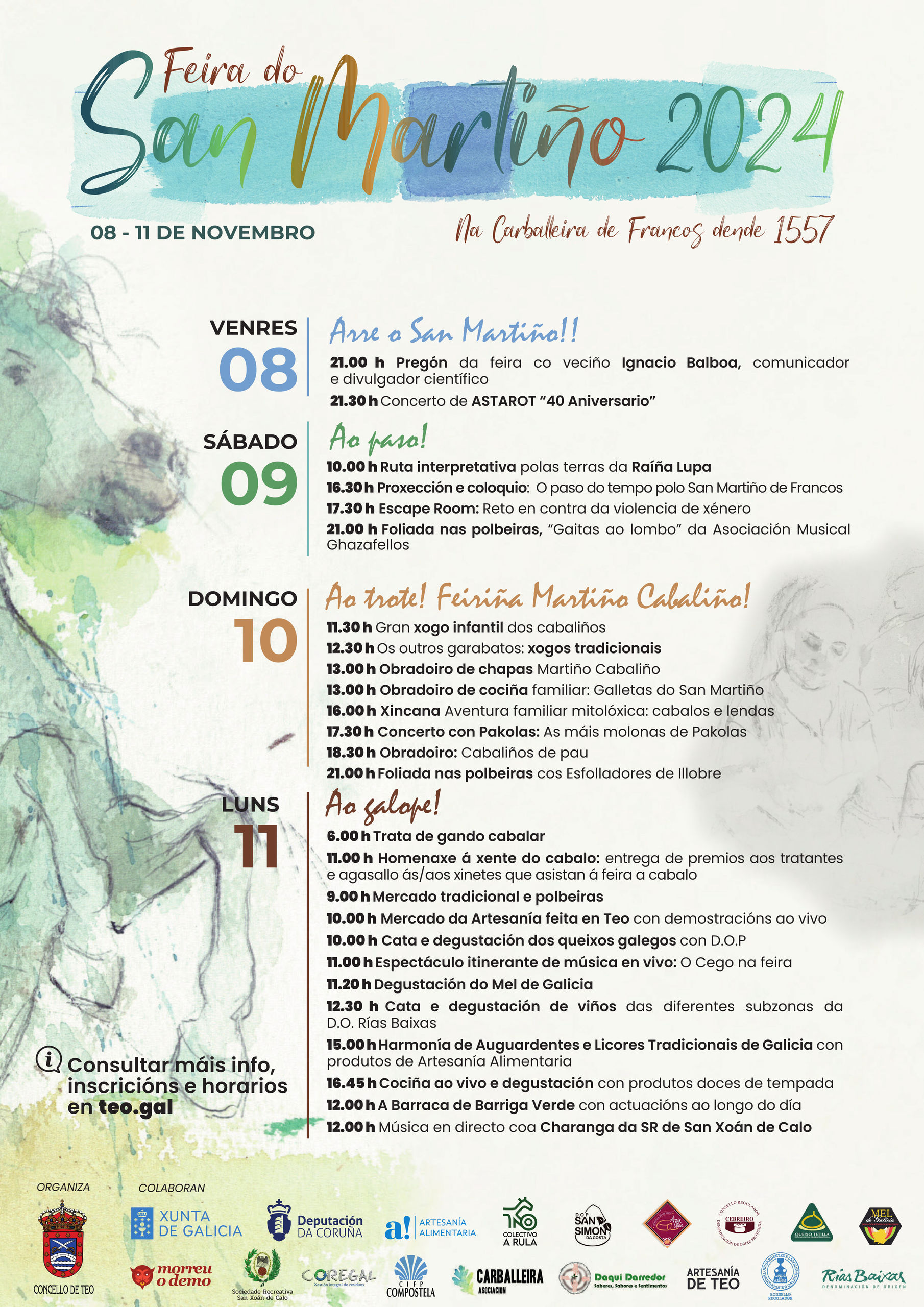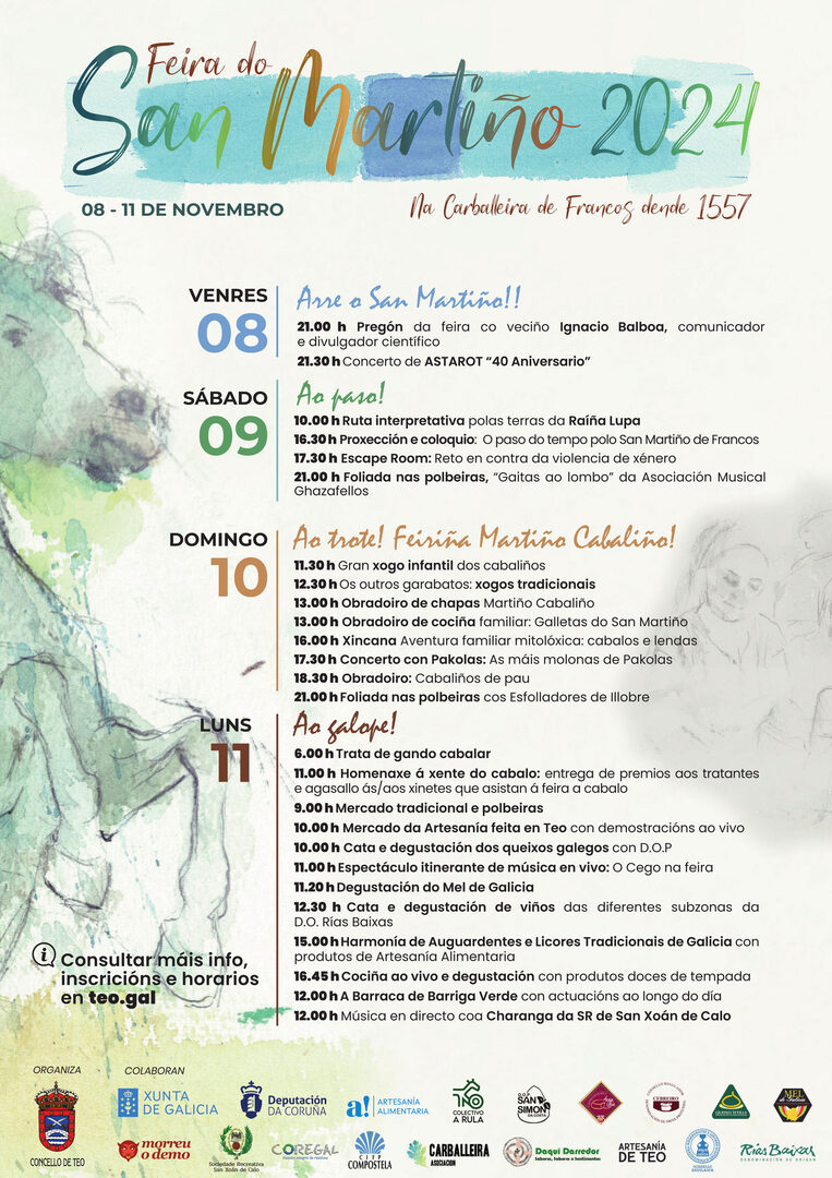 La Feria de San Martiño de Teo 2024 arrancará este año con el concierto de Astarot y contará con una entrega de premios para los propios comerciantes. El comunicador científico Ignacio Balboa, será el encargado de dar el pregón el viernes 8 de noviembre en la Carballeira de Francos Durante todo el fin de semana se programan diversas actividades, talleres y juegos para toda la familia Este año, con el objetivo de homenajear a la gente del caballo, se realizará una entrega de premios a los comerciantes que participen en la feria y un pequeño obsequio para todas aquellas personas que asistan a la feria a caballo. Sigue apostando por el mercado tradicional y artesanal, potenciando así los productos locales de temporada y de calidad. Todos los días serán amenizados por grupos locales de música tradicional, con el fin de resaltar nuestra cultura e identidad. Esta feria, que se celebra cada año el 11 de noviembre, está especializada en la venta de Ganado de caballo, mulos y asnos y tiene más de 500 años. De hecho, en hoy sigue siendo una de las fechas de referencia en el calendario festivo y emotivo de Teo. Precisamente, dada su relevancia y peso en el municipio de Teo, el Gobierno local consideró necesario solicitar de nuevo a la Xunta de Galicia su declaración como Fiesta de Interés Turístico de Galicia, apelando a su alto valor cultural, gastronómico y etnográfico, destacando sus características centradas en la tradición ganadera del país y promocionando también los productos locales y artesanos.