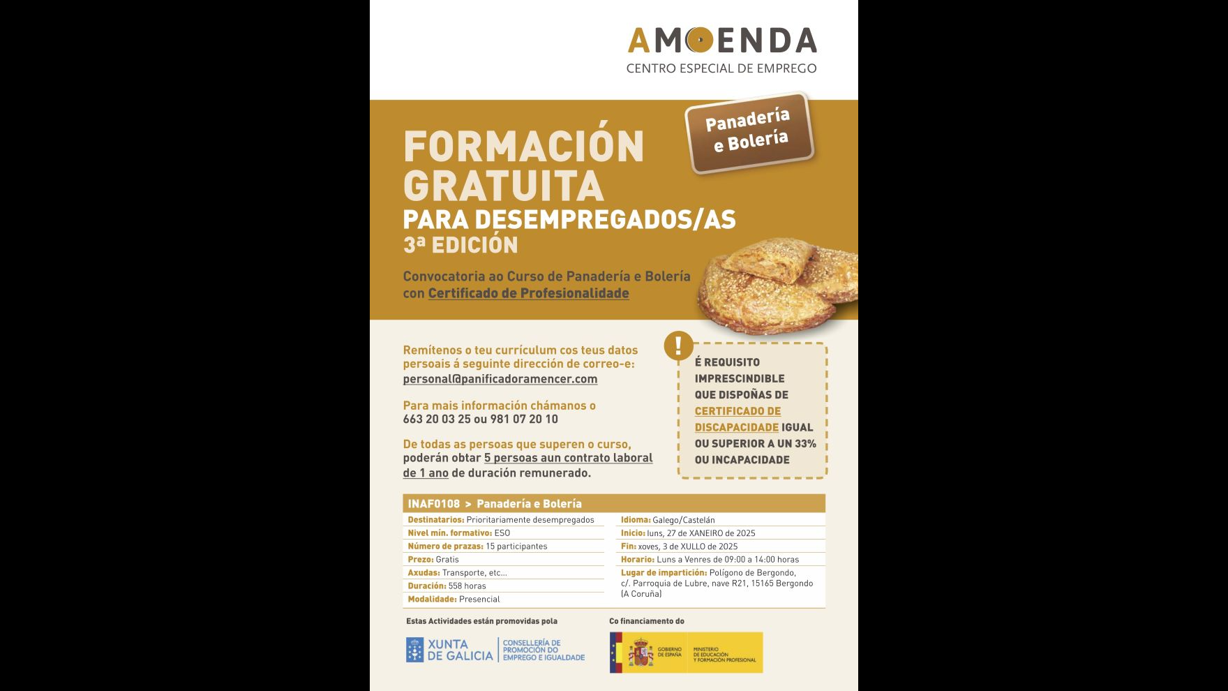 El Centro Especial de Empleo Amoenda abre la III convocatoria del Curso de Panadería y Bollería con Certificado de Profesionalidad. Se trata de formación gratuita para personas desempleadas que puedan presentar su certificado de discapacidad igual o superior a un 33% o una incapacidad.