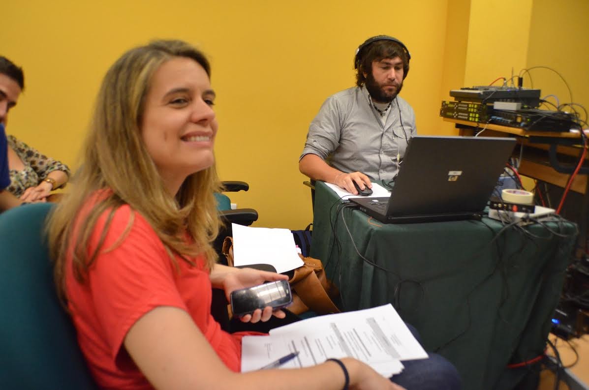 Marta Cotarelo, productora de 'Es la tarde de Dieter' e Isaac Vizcaíno, técnico del programa, durante la emisión en directo de esRadio desde la Universidad Europea Miguel de Cervantes de Valladolid.