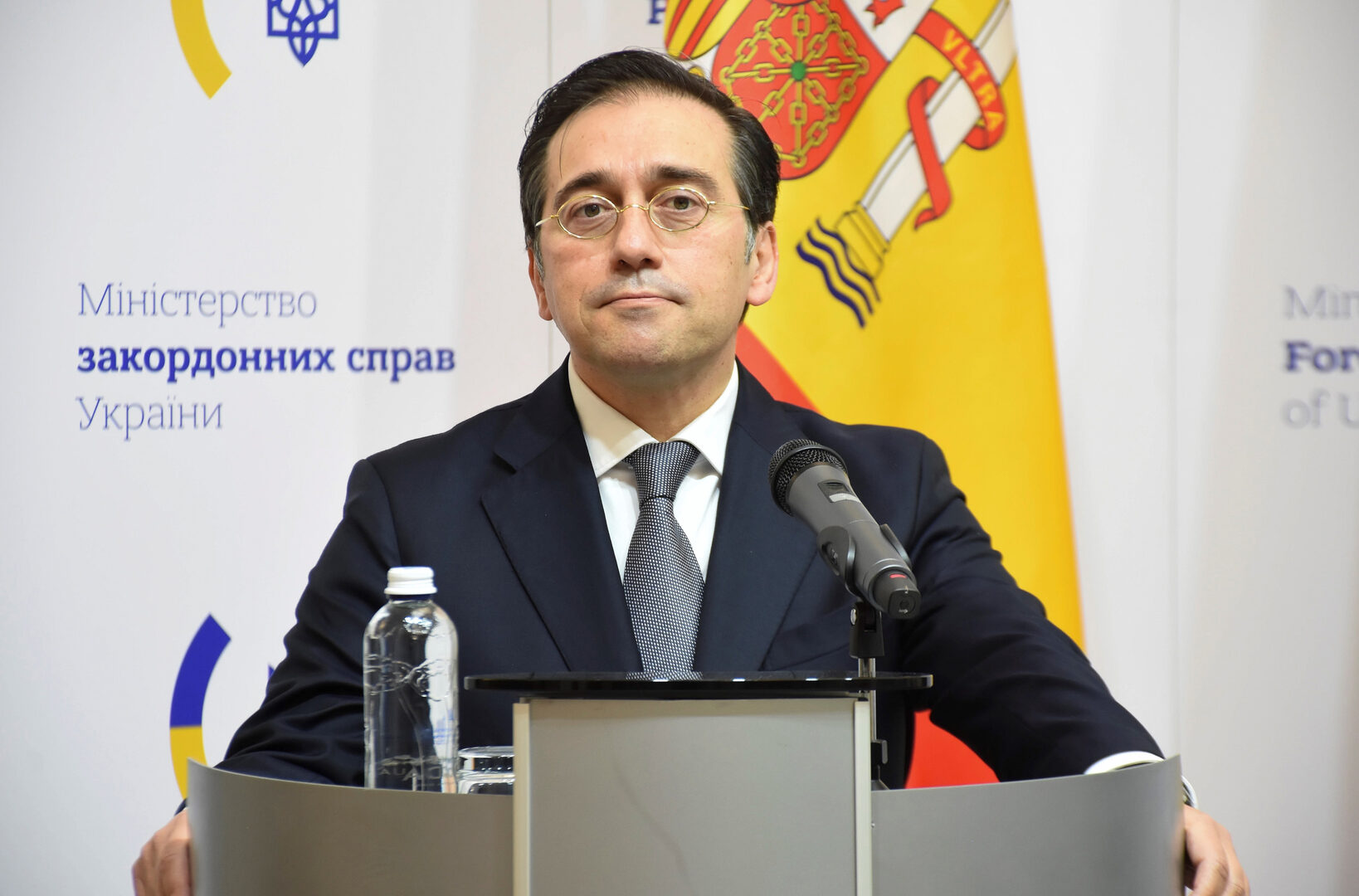 El Ministro de Relaciones Exteriores, José Manuel Albares, durante una conferencia de prensa conjunta con su homólogo ucraniano en Kiev (Ucrania). | EFE/EPA/SOPHIA SHOVIKOVA