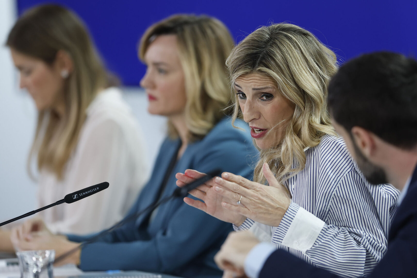 MADRID (ESPAÑA), 11/02/2025.- La ministra de Trabajo y vicepresidenta segunda del Gobierno, Yolanda Díaz (2d) durante la rueda de prensa tras el Consejo de Ministros celebrado este martes en el Palacio de la Moncloa, Madrid. EFE/ Mariscal | EFE