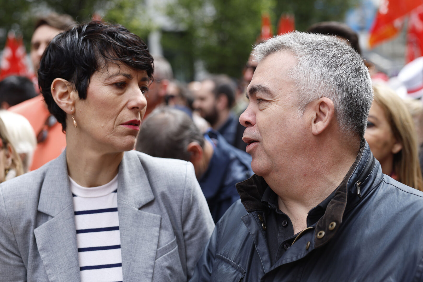 La ministra de Inclusión, Seguridad Social y Migraciones, Elma Saiz (i) junto al secretario de organización del PSOE, Santos Cerdán durante la manifestación convocada por los dos grandes sindicatos, CCOO y UGT, este miércoles en Madrid, en un Primero de Mayo que tiene como lema 'Por el pleno empleo: reducir jornada, mejorar salarios'. EFE/Mariscal | LD/Agencias