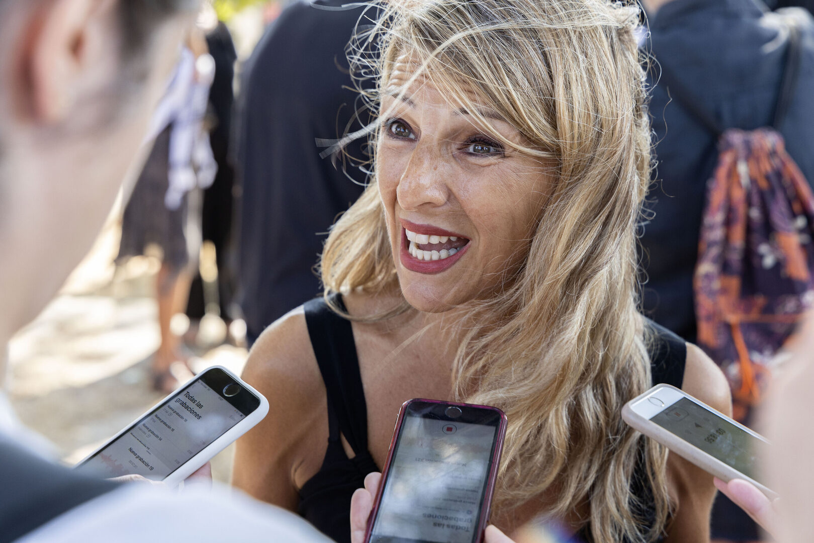 NIGRÁN (PONTEVEDRA), 15/08/2025.- La vicepresidenta segunda y ministra de Trabajo y Economía Social, Yolanda Díaz, ofrece declaraciones a los medios mientras participa en la manifestación convocada en favor del pueblo palestino este viernes, en la Playa de Playa América de Nigrán (Pontevedra). Yolanda Díaz se ha sumado a las centenares de personas que este viernes se han concentrado en la Playa América de Nigrán (Pontevedra) para denunciar la crisis humanitaria en Gaza y el genocidio por parte de Israel sobre el pueblo palestino. La marcha, convocada por la plataforma 'O Val Miñor apoia a Palestina', ha arrancado en el campo de fútbol de Lourido a las 18 horas, para continuar después su recorrido por la orilla de Playa América, un extenso arenal de 1,2 kilómetros ante la mirada de los turistas y veraneantes, que en algunos casos han reaccionado con aplausos y tirando fotografías. EFE/ Salvador Sas | EFE