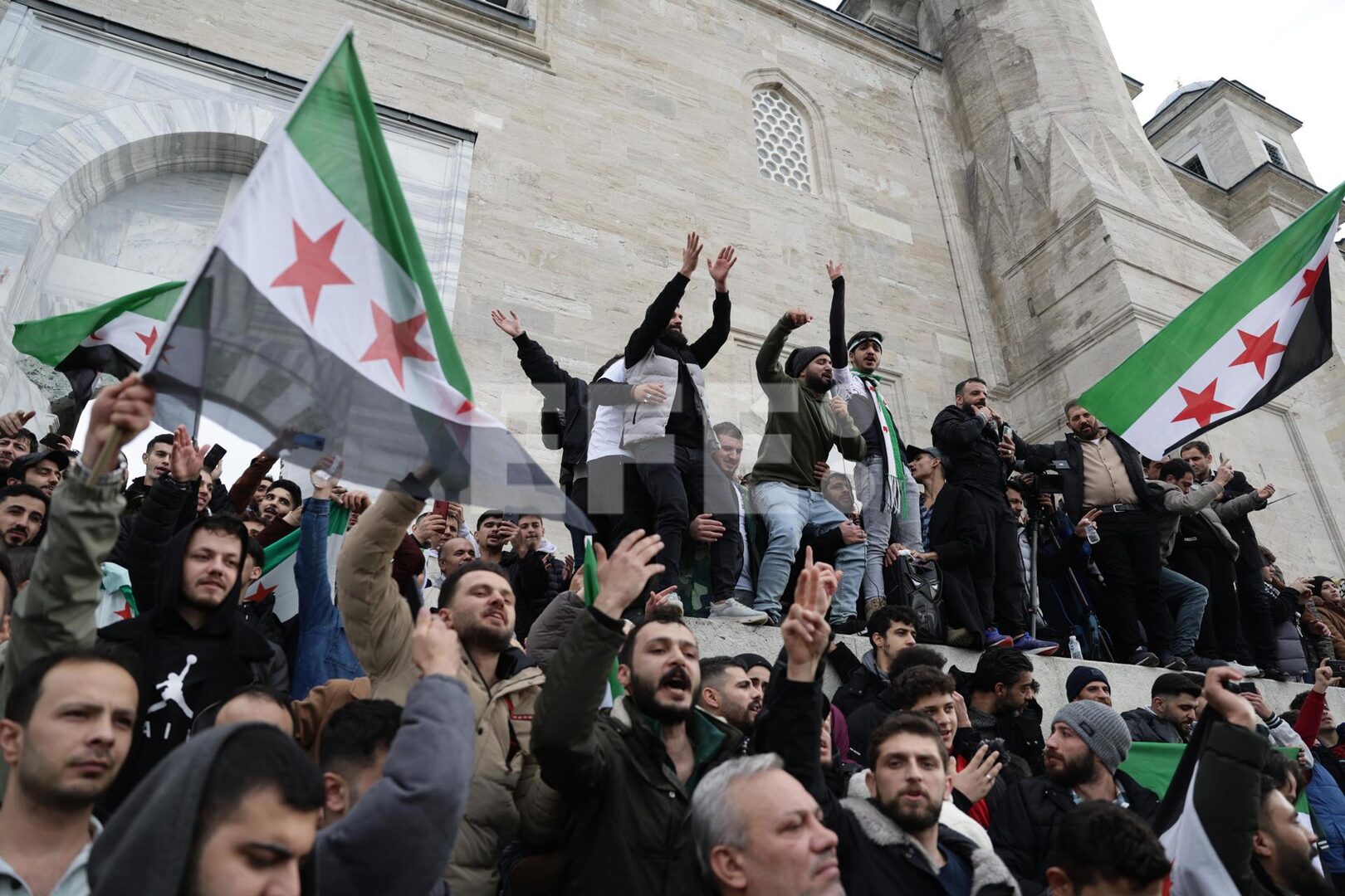 Los partidarios de la oposición siria que residen en Turquía enarbolan la bandera siria de la oposición y celebran la toma rebelde de Damasco en la mezquita Fatih en Estambul | EFE