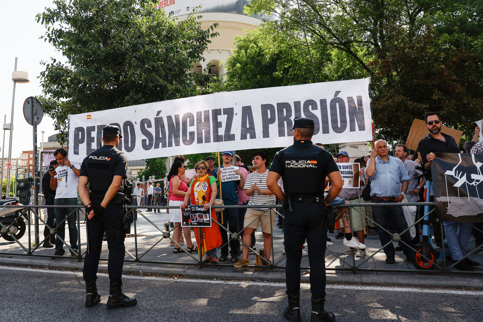 Varias personas congregadas en los alrededores del Juzgado de Instrucción número 41 de Madrid donde el juez Juan Carlos Peinado interroga este viernes a Begoña Gómez, esposa del presidente del Gobierno, Pedro Sánchez, para determinar si incurrió en tráfico de influencias y corrupción en los negocios, fundamentalmente con relación a varios contratos públicos adjudicados al empresario Juan Carlos Barrabés. | EFE