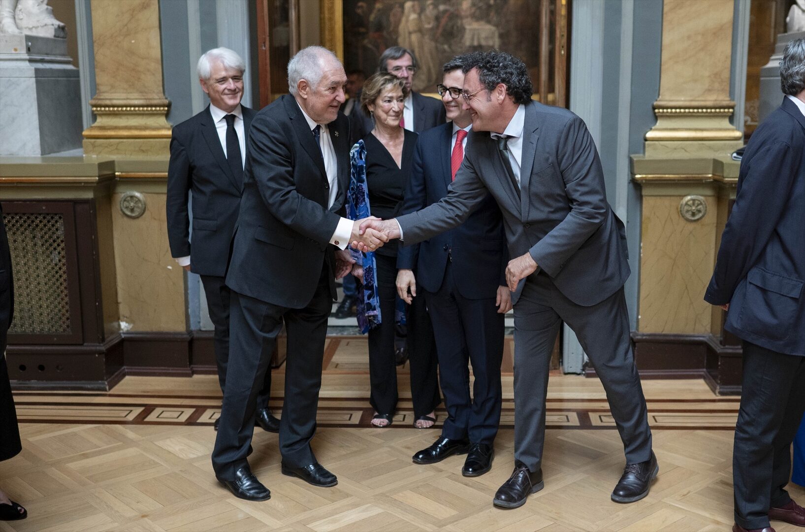 El presidente del Tribunal Constitucional, Cándido Conde-Pumpido, saluda al Fiscal General antes de la toma de posesión del presidente del Consejo Gen | Europa Press