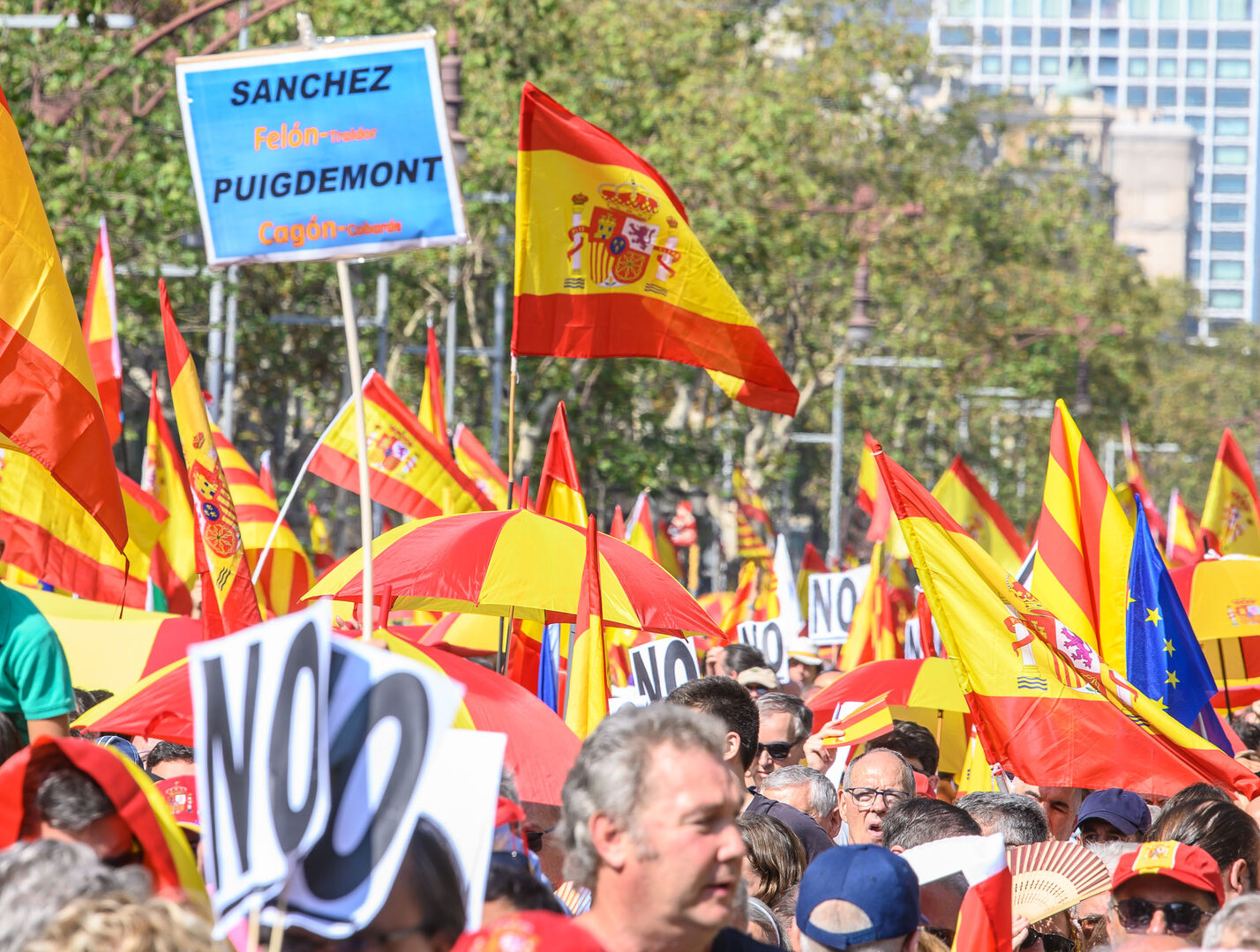 "Sánchez felón, Puigdemont cagón" reza un cartel azul, pequeño pero muy visible en el mar de rojo y amarillo. | C.Jordá