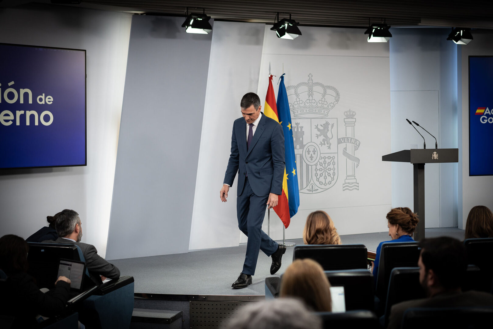 El presidente del Gobierno, Pedro Sánchez, tras su comparecencia ante los medios, en el Palacio de la Moncloa, a 29 de abril de 2025, en Madrid (España). | Europa Press