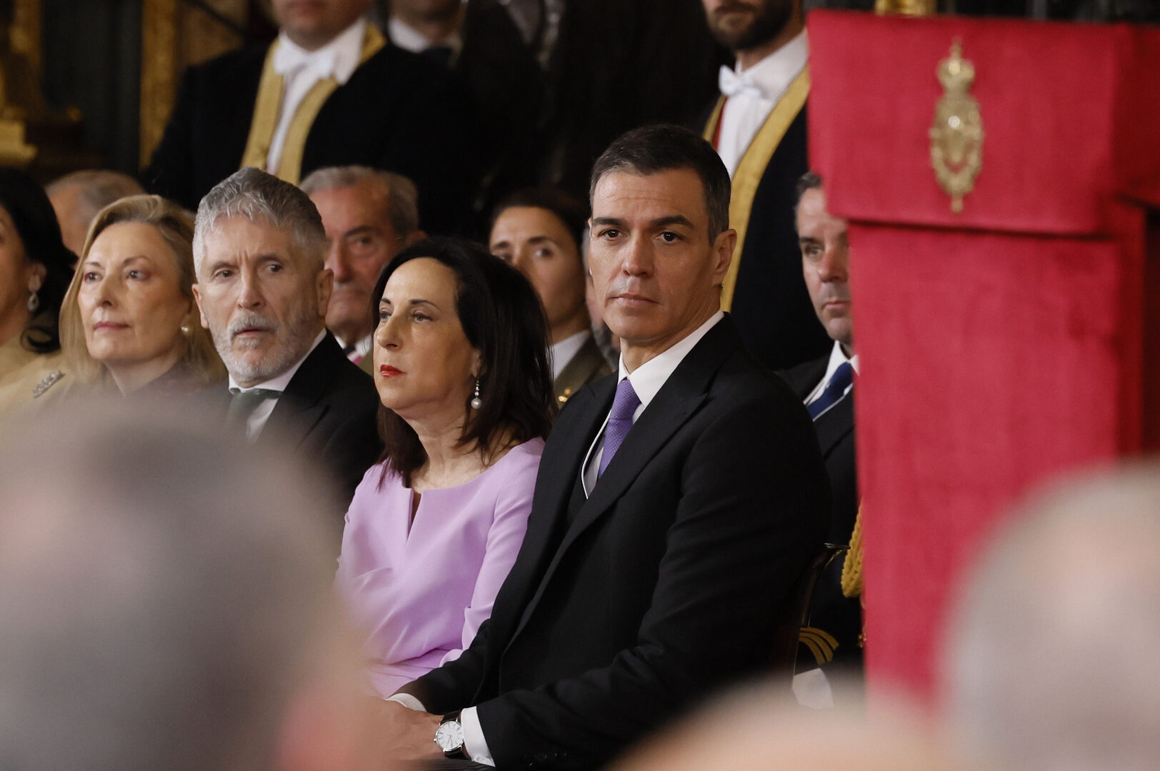El ministro del Interior, Fernando Grande-Marlaska (2i), la ministra de Defensa, Margarita Robles (c), y el presidente del Gobierno, Pedro Sánchez (d), durante la celebración de la Pascua Militar. | EFE